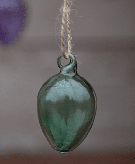 Ägg i grönt glas att hänga i tex påskriset. Vackert äggformat med snöre upptill. Glaset släpper igenom och reflekterar ljuset vackert.