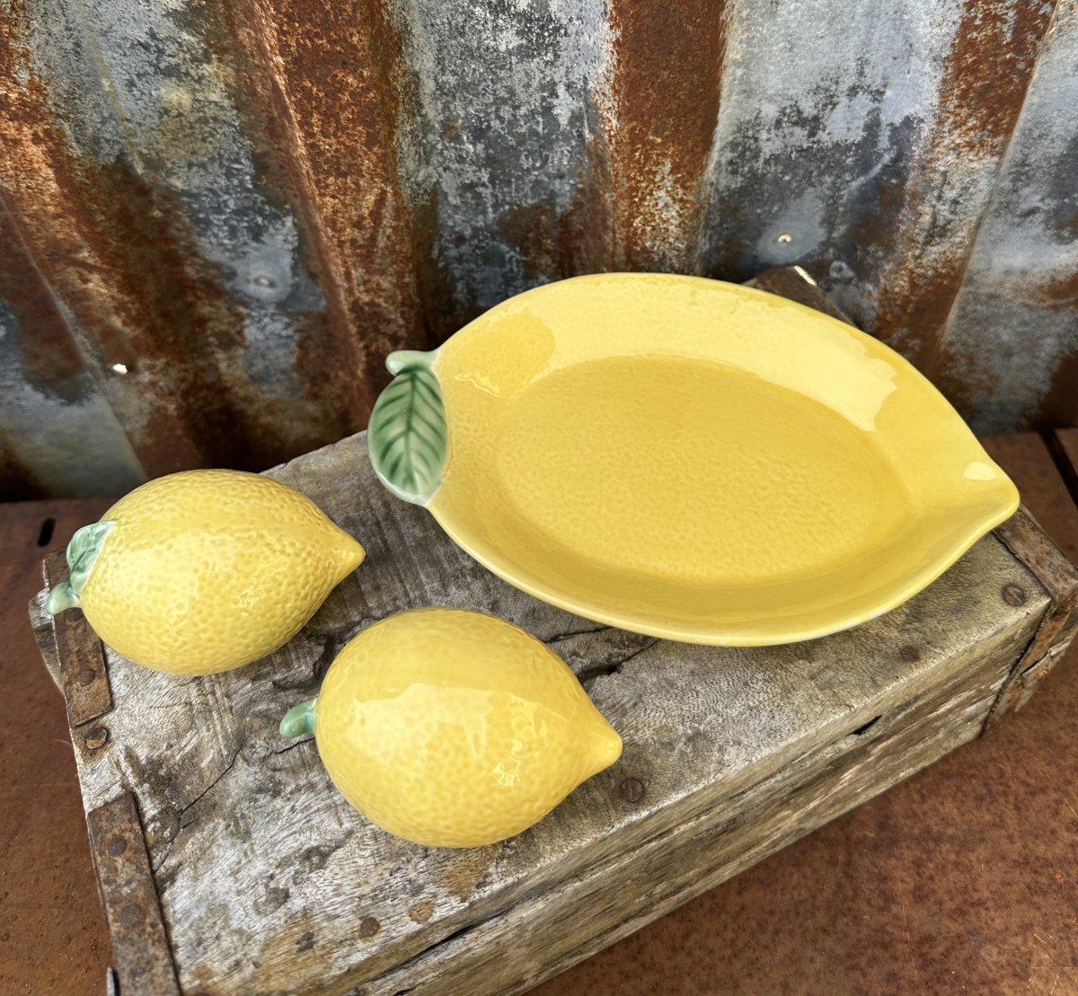 Citron serie Skörd i porslin. Vackert solskens gult med grön detaljer finns i tre delar.