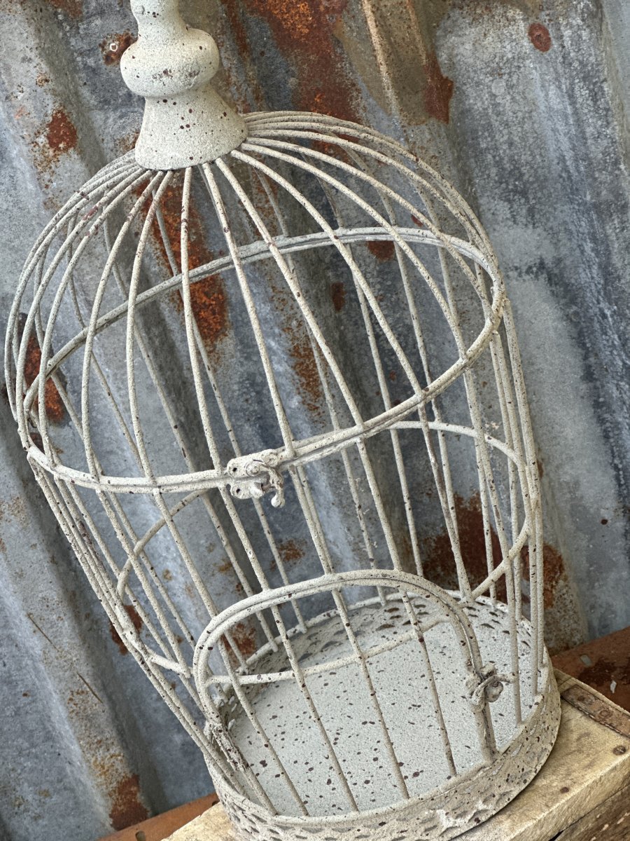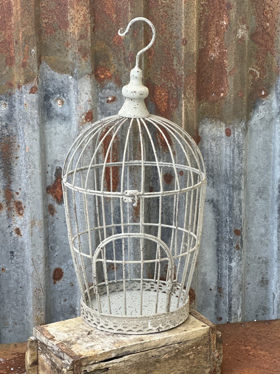 Vacker och elegant fågelbur i ruffig antik stil. Öppningsbar modell med lucka och öppningsbart tak. Krok upptill så buren kan hängas. Plan botten så den också kan stå. Ruffig ytan går i en grå nyans med bruna rost inslag.