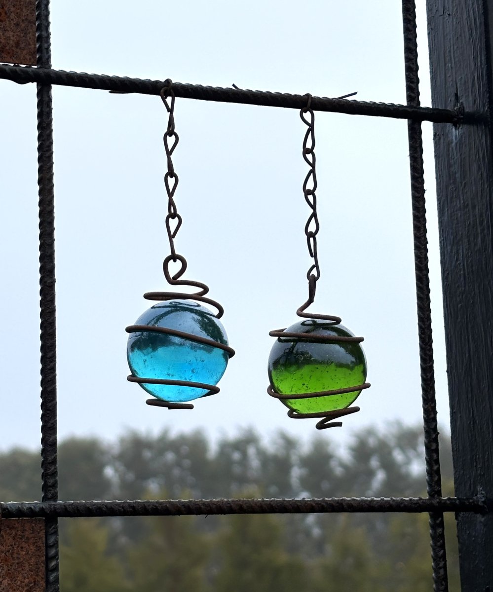 Färgad kula i glas och rost att hänga i tex armeringsnät