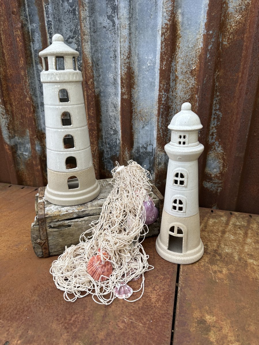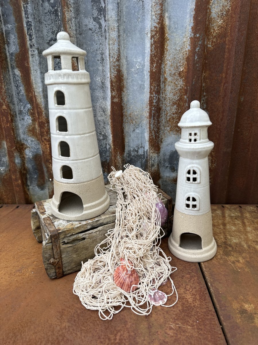 Vacker fyr i keramik att dekorera med. Havs inspirerad i vita och sand färgade nyanser. Finns i två modeller