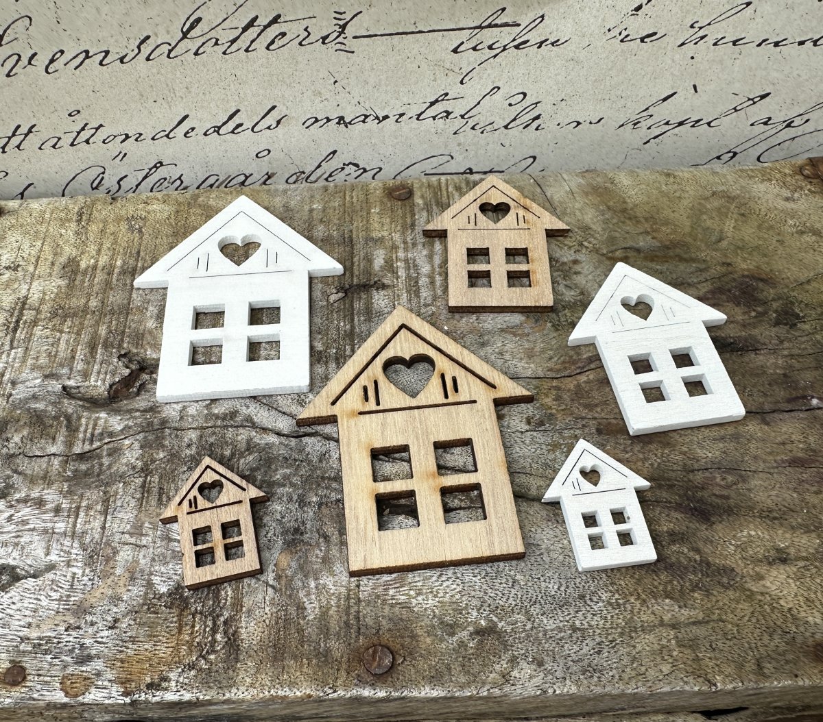 Hus i trä att dekorera, pynta och pyssla med. I mindre modell tillverkad i trä. Finns i två nyanser och tre olika storlekar