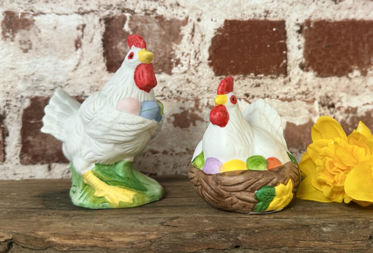 Klassisk glad påsk tupp och höna i keramik. Vita med färgglada inslag. Säljes var för sig