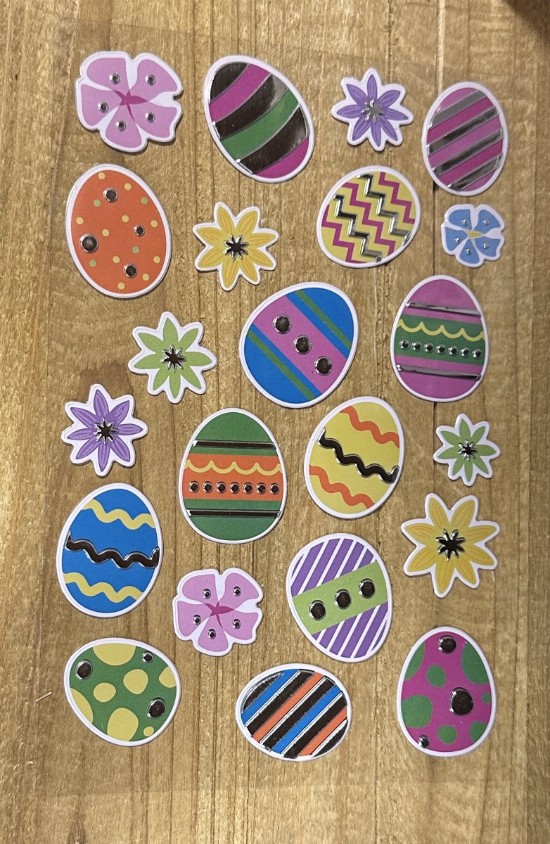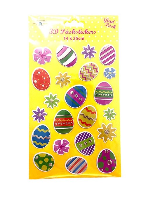 Klistermärken påsk med 3D effekt. I ark med mixade ägg och blommor i glada färger.