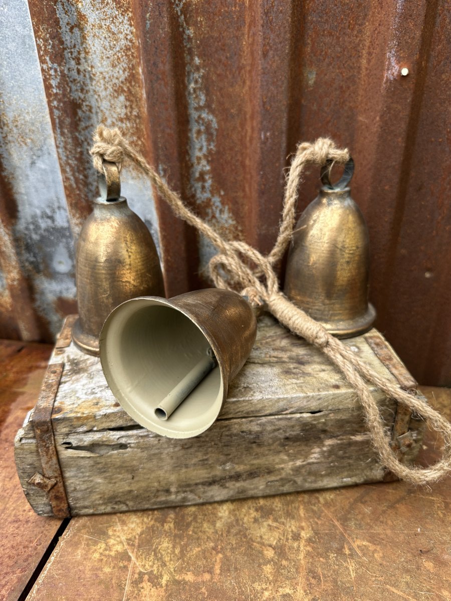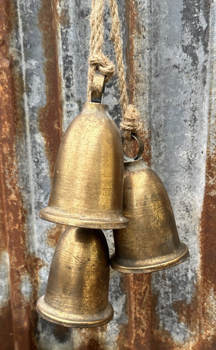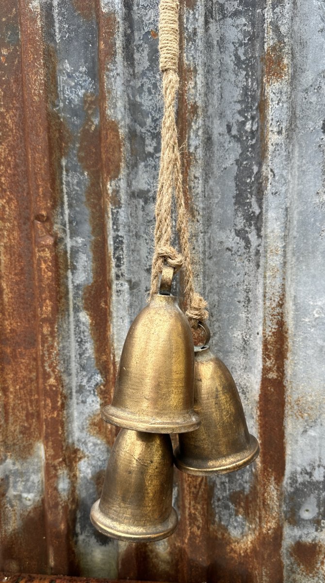 Stor vacker klocka / bjällra i antik guld. I modell med tre stora klockor / bjällror som sitter i klase på jutesnöre. Med vacker klang och fin rundad modell. Klockorna / bjällrorna är tillverkade i plåt.