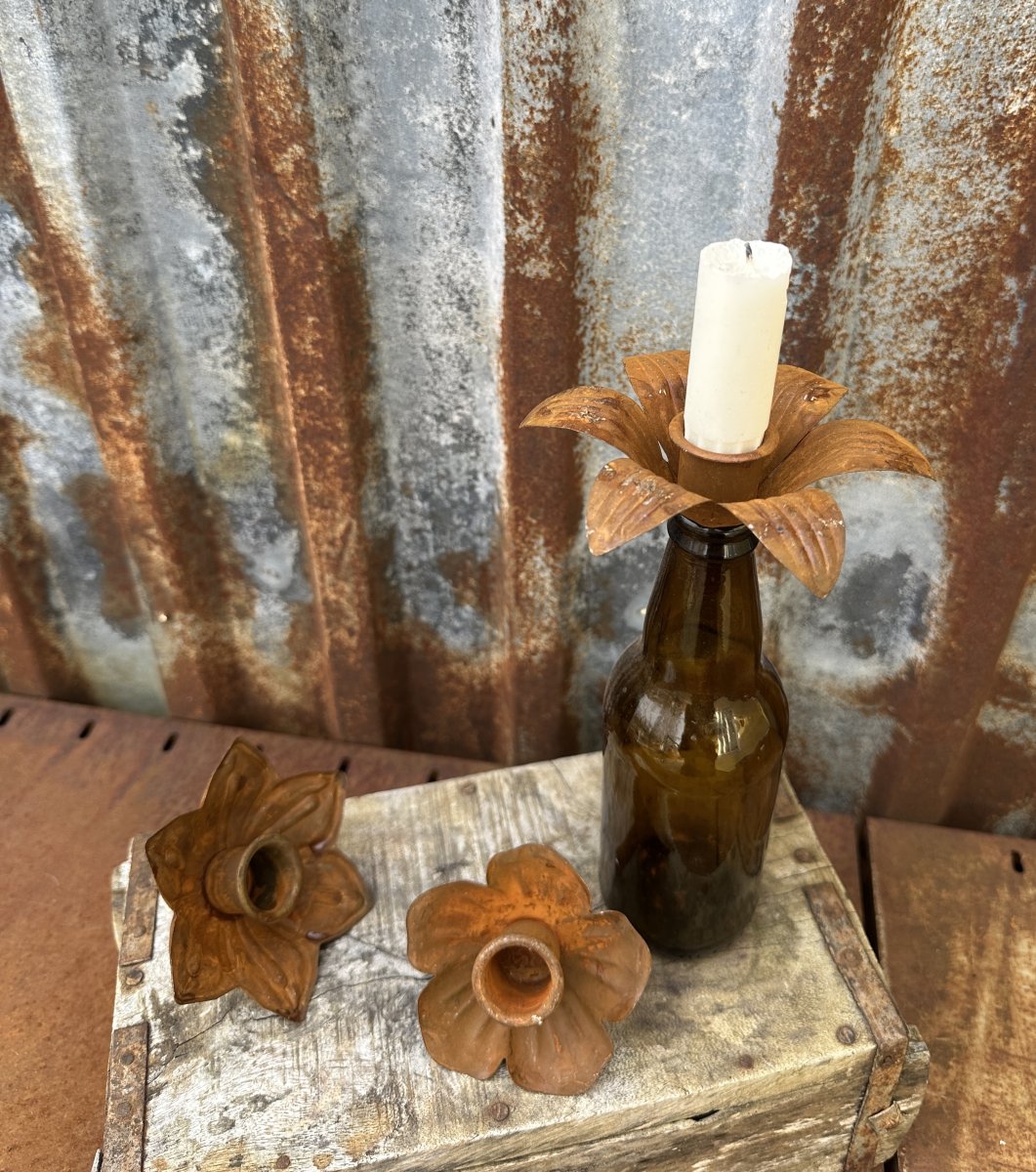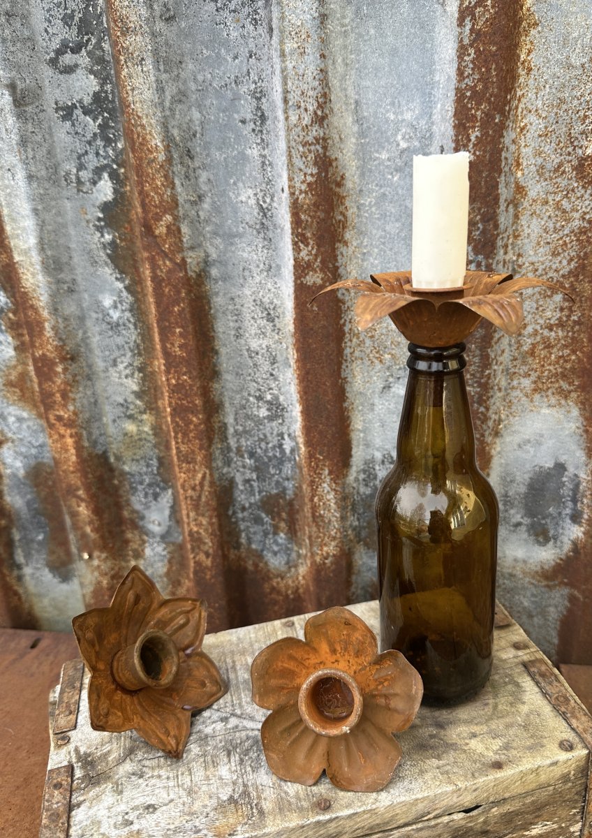 Ljushållare blomma i rost. Att sätta i en flaska eller liknande och göra till en ljusstake. Finns i tre modeller