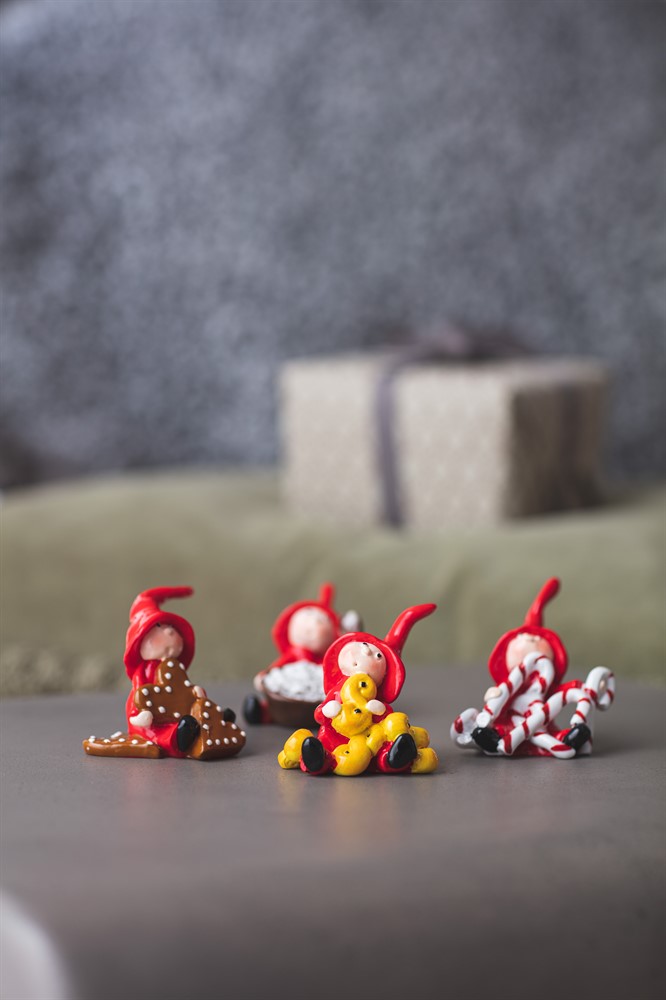 • Jul och finter barn med röda luvor och filt kläder. Modell som kan hängas ( snöre i luvan ) Finns i två modeller -Pojke -Flick
