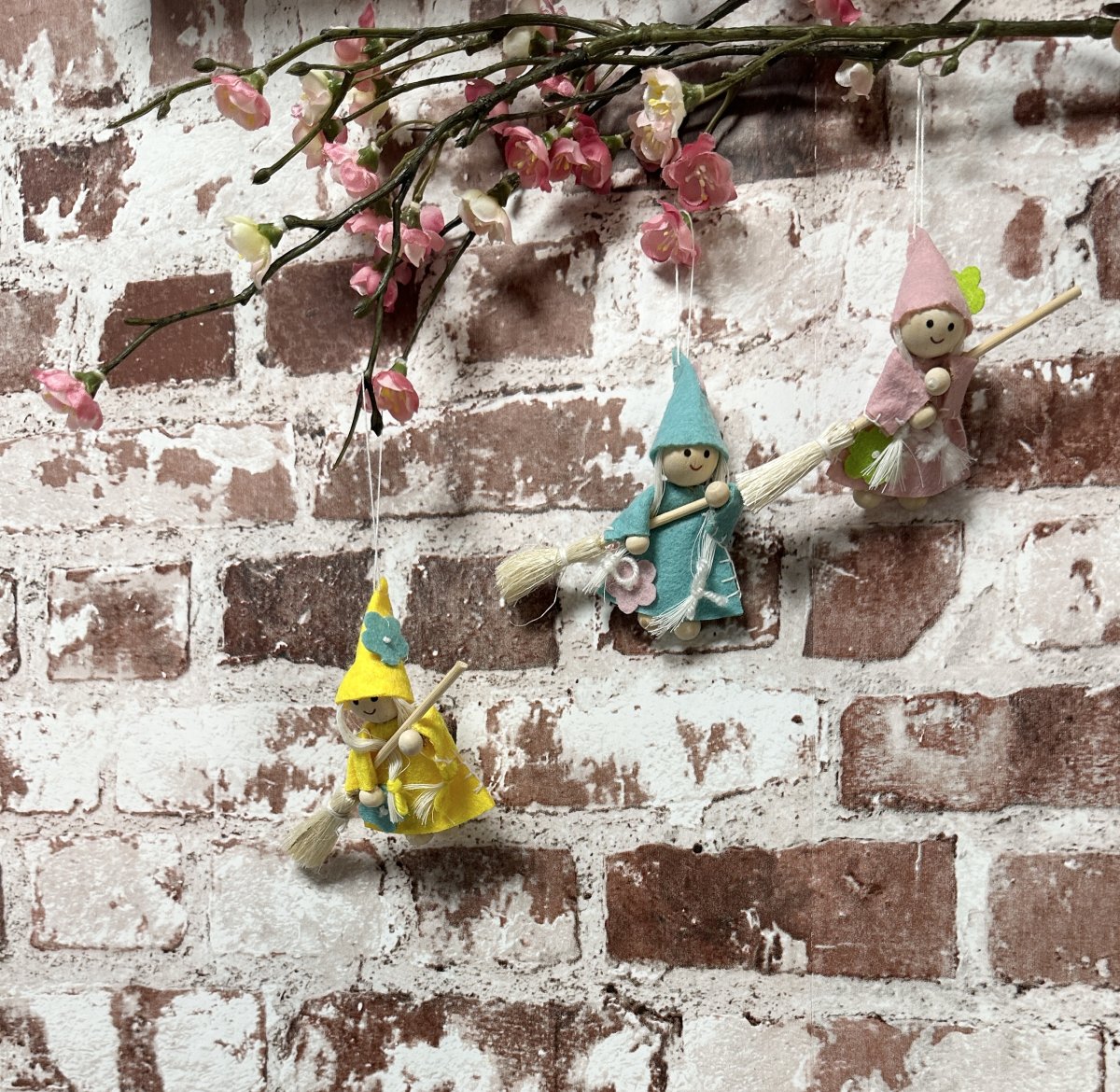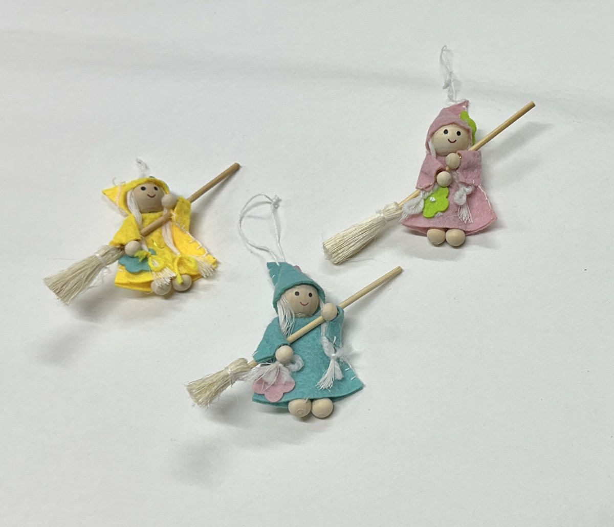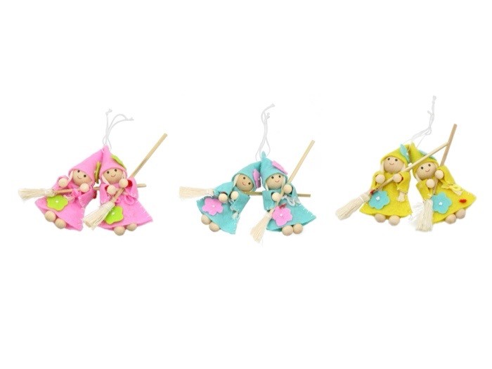 Söt påskkärring med kvast och blomma. Finns i tre olika pastell nyanser