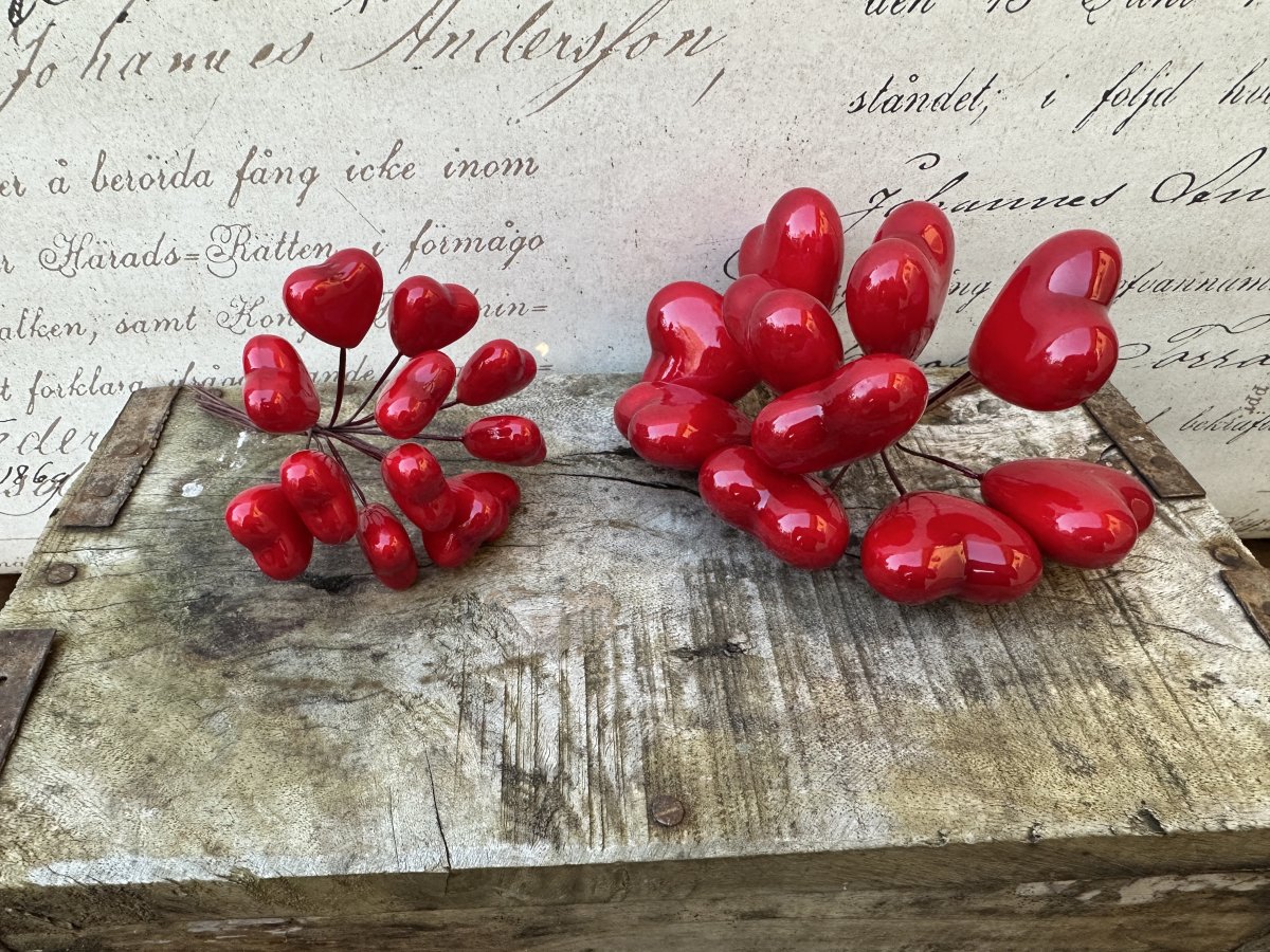 Röda hjärtan på stick att dekorera med. Finns i två modeller