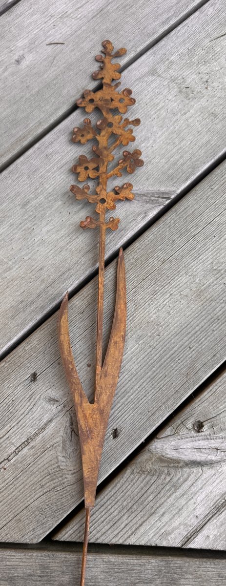 Rostig hög blomma med flera blommor och blad, i stick modell dvs på pinne att sätta i marken, rabatten eller blomkrukan. Tillverkad i metall med pinne i lite kraftig kvalité nertill.