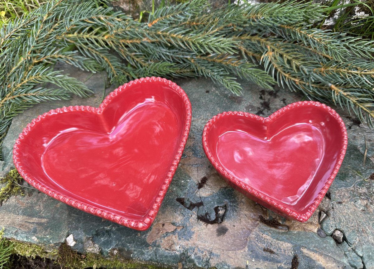 Rött hjärtformat fat i porslin . I skål modell med en liten kant runt om. Dekorerad överkant med ett pärlband i porslinet, finns i två storlekar