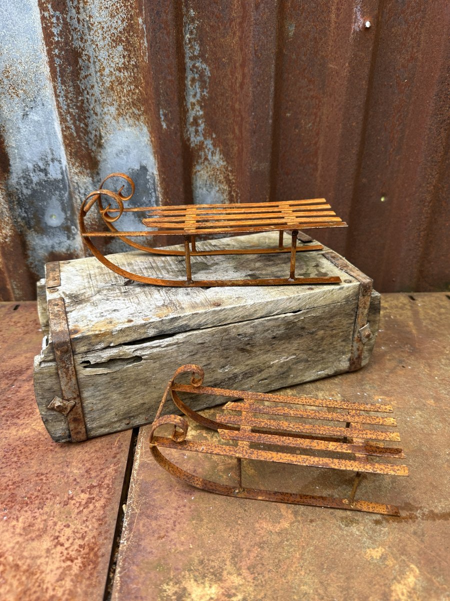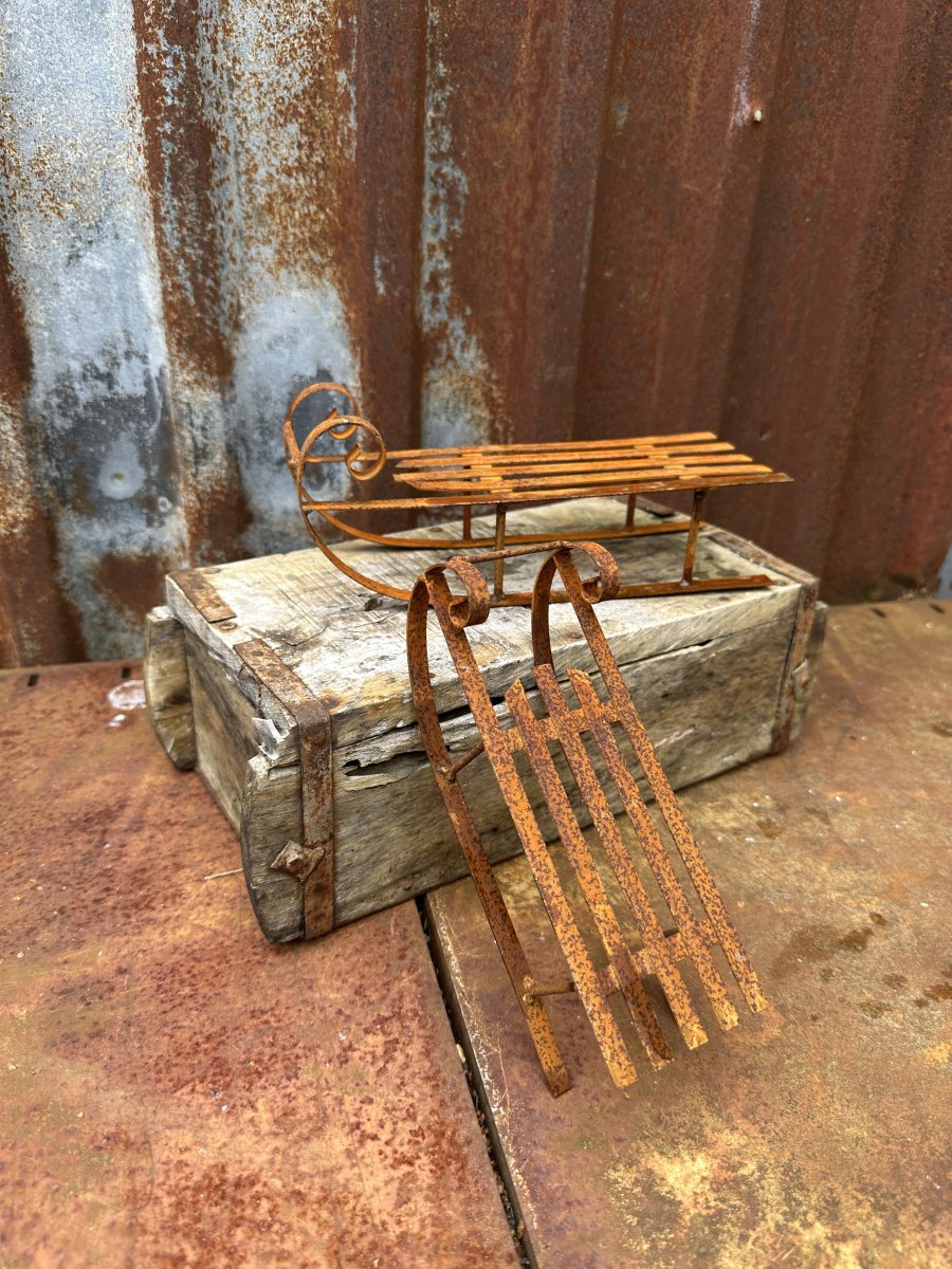 Släde i rost att dekorera med. Gammeldags designad med fina detaljer. Finns i två storlekar