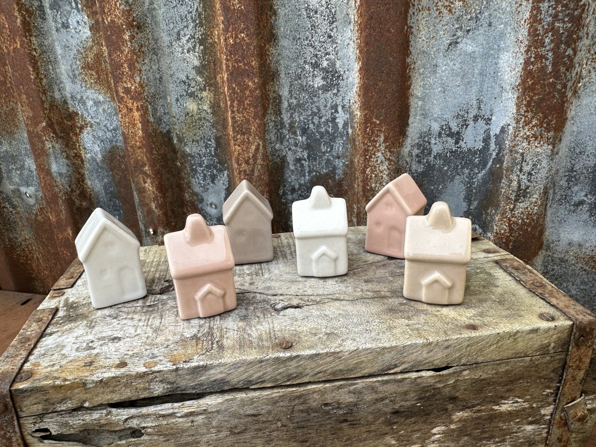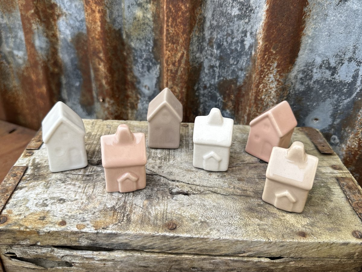 Hus i porslin mindre modell att dekorera med. Finns i två olika modeller och tre olika nyanser