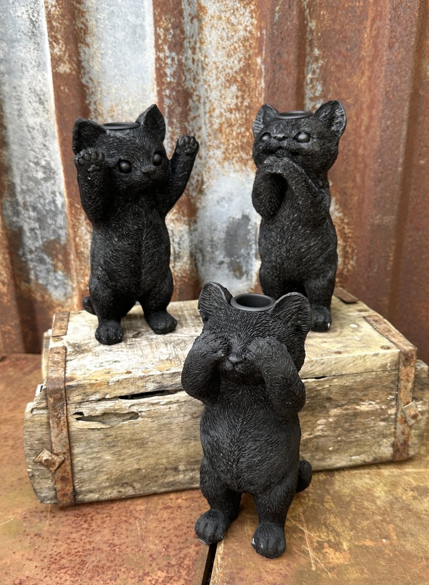 Söt och gullig svart katt ljusstake. Detaljrik och välarbetad finns i tre olika modeller