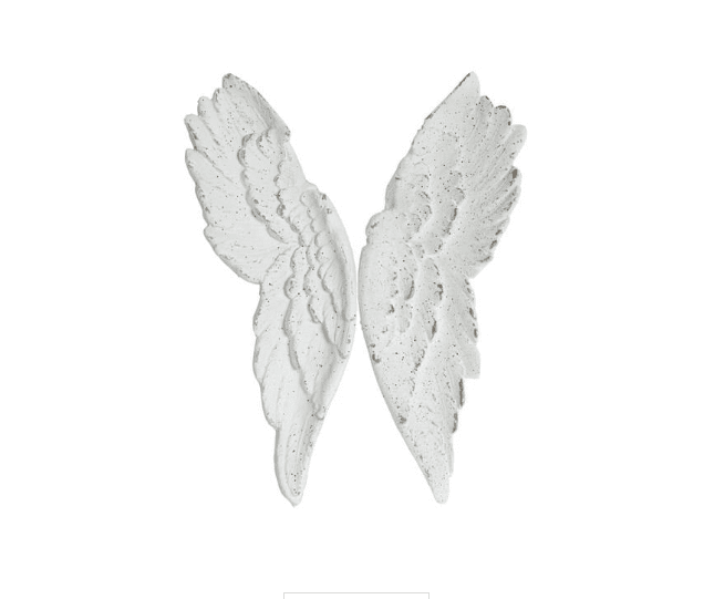 Stora vingar änglavingar att sätta på väggen. Vita / Cream vita i lantlig fabriks sliten stil med nötta inslag av beige i den vita ytan. Väggfäste för upphängning på baksidan. Säljes i par om två vingar. Tillverkade i lite tyngre keramik material.