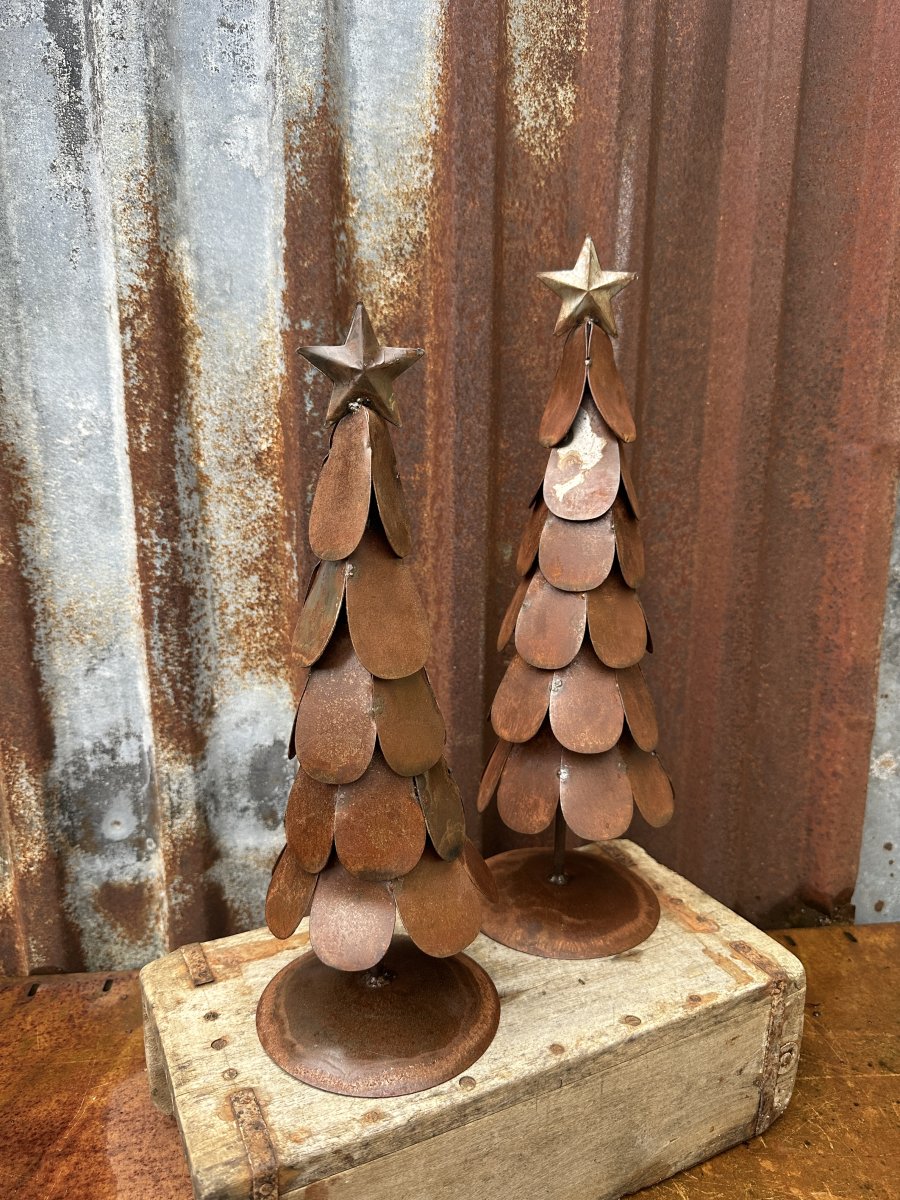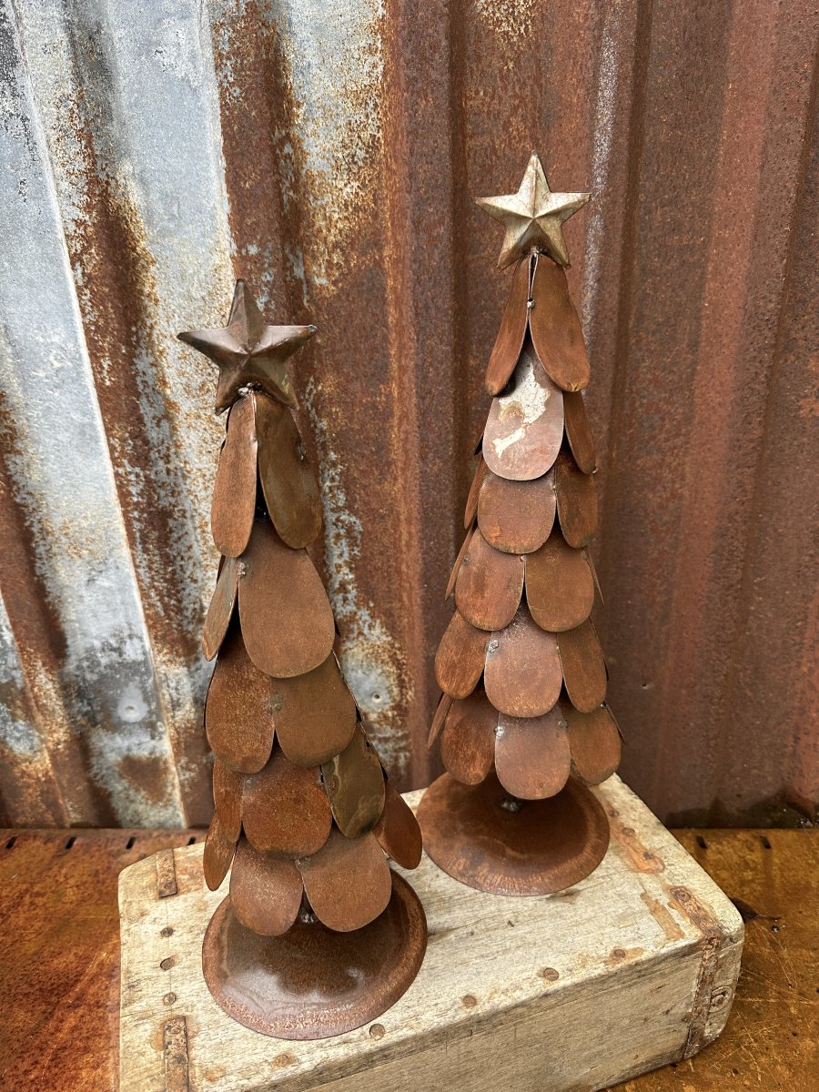 Större gran / julgran i rost och zink att dekorera med. I hel bit ( ej delbar) tillverkad i plåt . Detaljrik med spretade rundande grenar och en stjärna upptill. Ruffiga i modellen. Finns i två storlekar