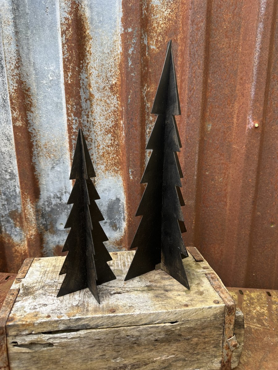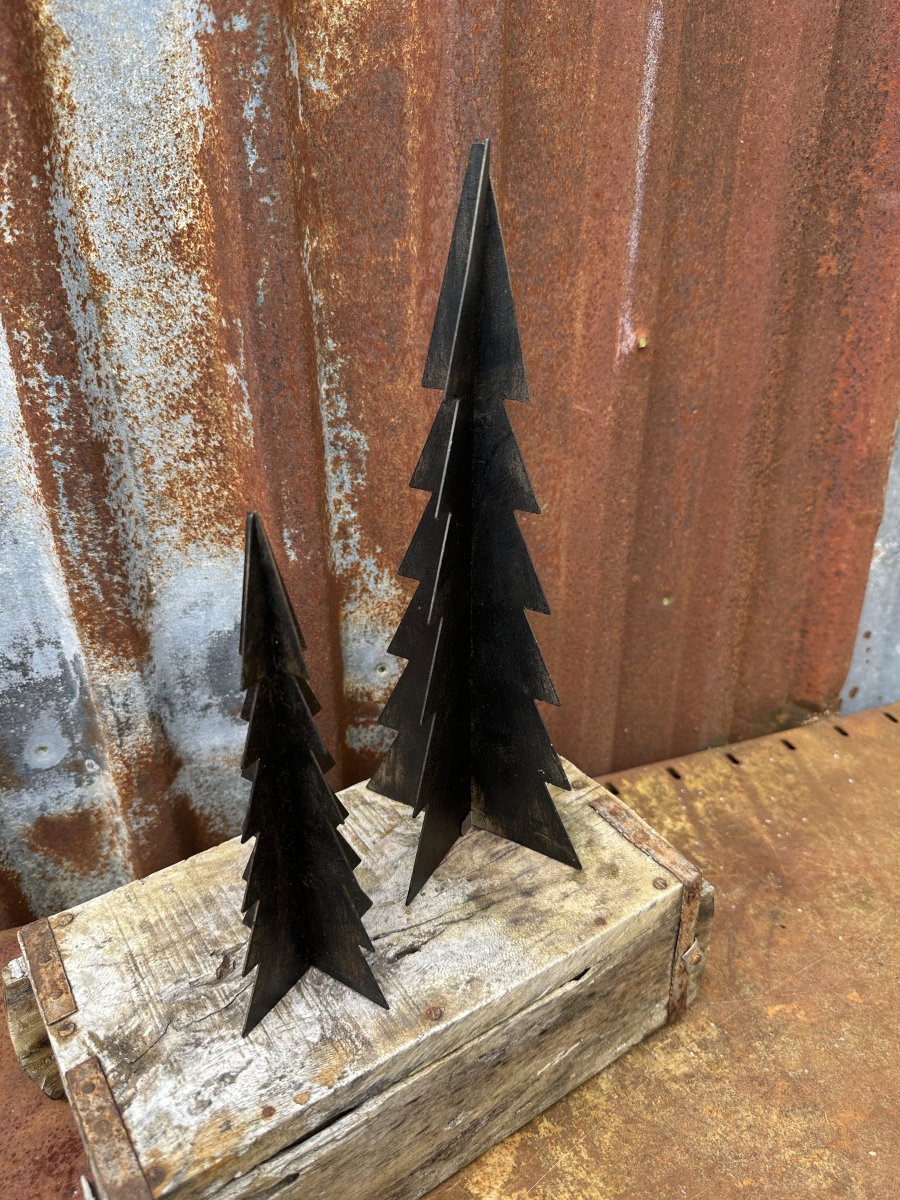 Gran i ruffig svart nyans. I modell som levereras platt så sätter man ihop granen som ett kryss. Finns i två storlekar