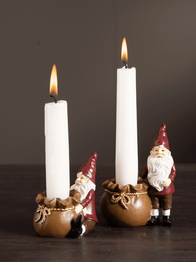 Tomte ljusstake i gammeldags modell. Tomte med säck, säcken är en ljusstake anpassad för vanliga ljus så kallade kronljus. Finns i två modeller