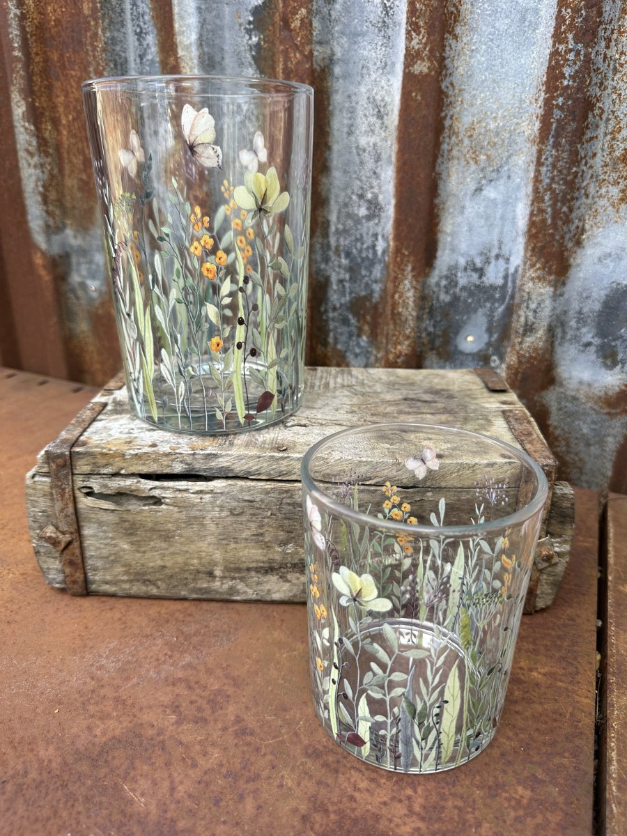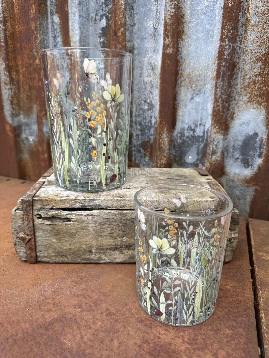 Vacker ljuslykta till lika vas med vackra sommar inspirerade blommor och fjärilar. Finns i två storlekar