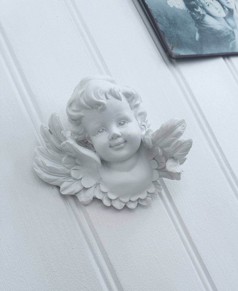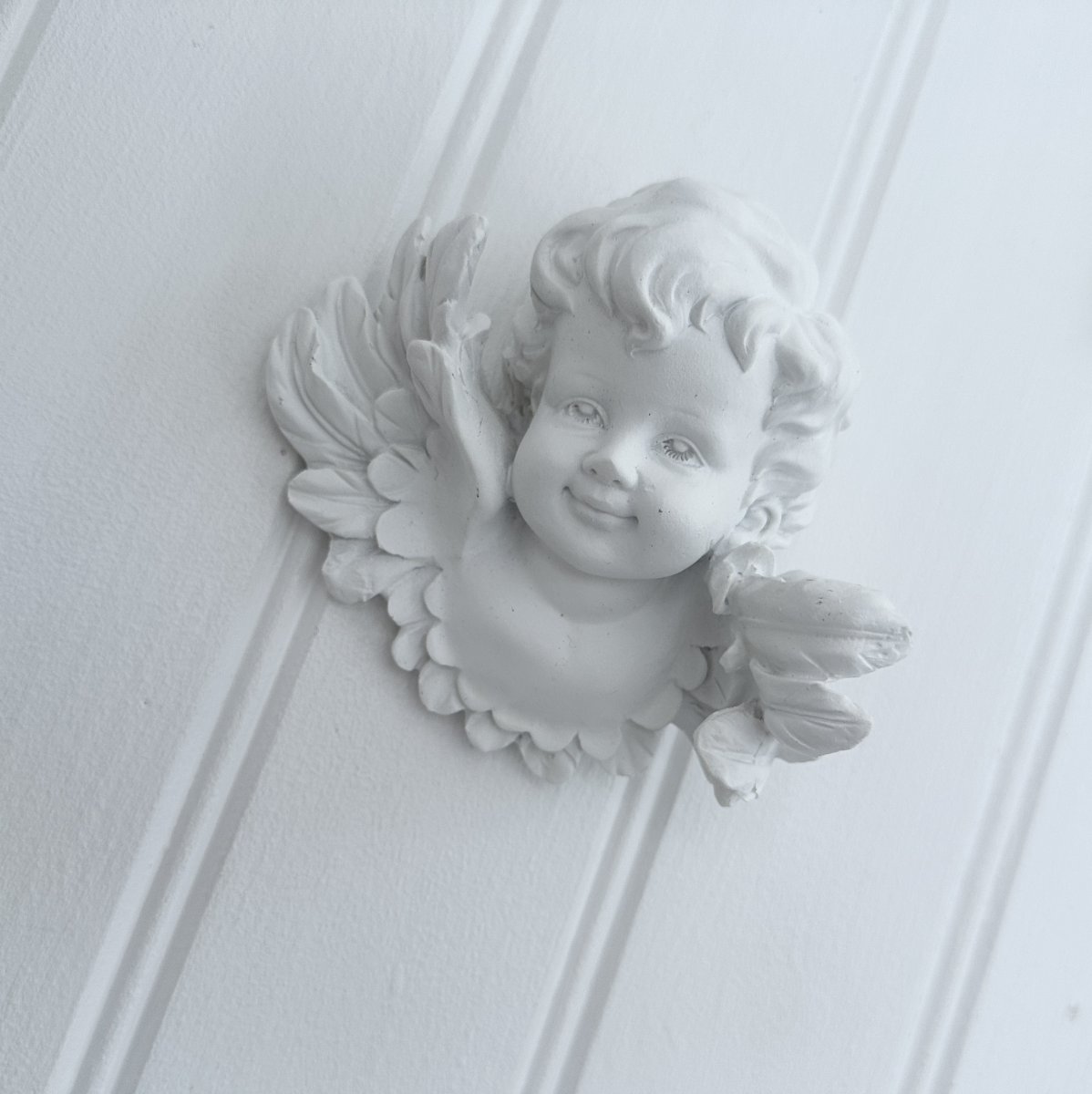 Vit ängel att sätta på väggen. Detaljfull och välarbetad med söta ansiktsdrag och synliga vingar . Väggfäste på baksidan för upphängning, platt baksida.