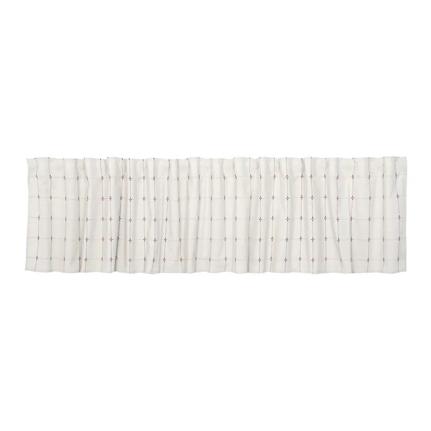 Gardinkappa Mia i linne chambray med röda broderade detaljer . Vackert gammeldags mönster som passar årets alla årstider. Tillverkade i återvunnet textil material.