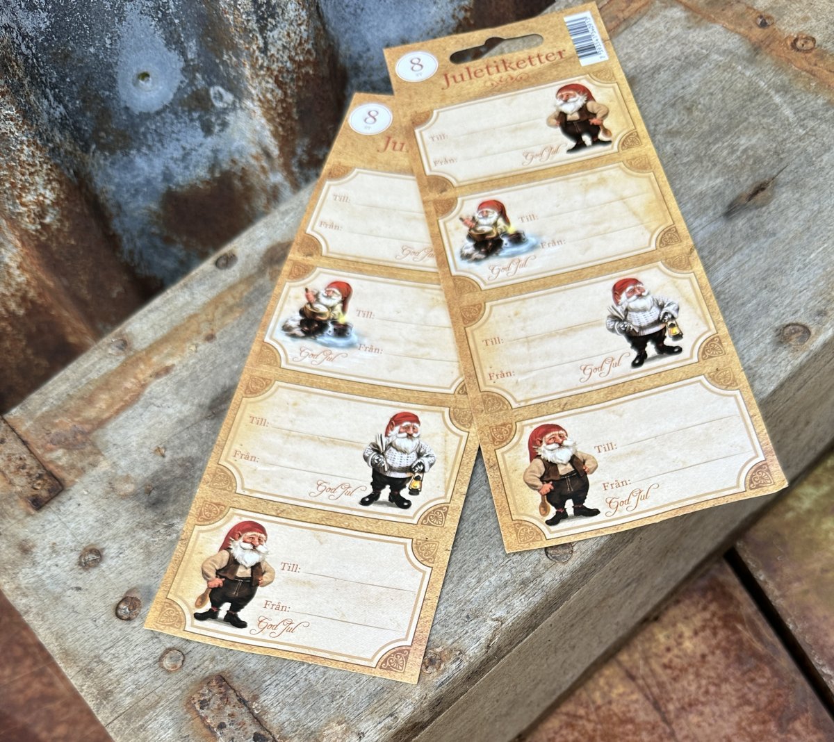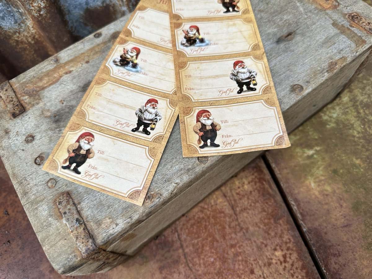 Juletikett till julklappar med tomte motiv och skriv rader. I förpackning om 8st etiketter som är självhäftande.