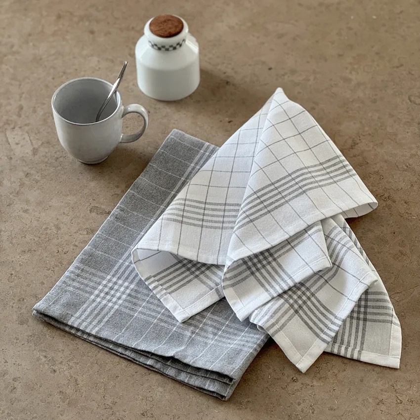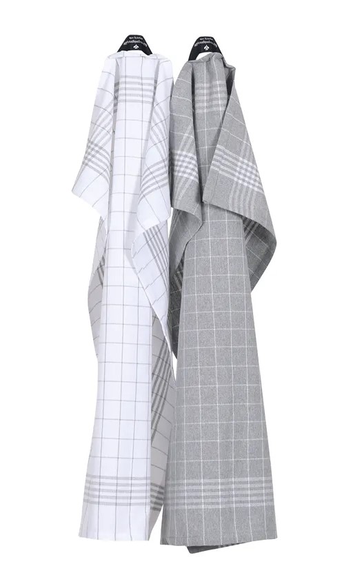 Astrid rutig klassisk kökshandduk som säljes i förpackning om två kökshanddukar en mer grå och en mer vit . Tillverkade i återvunnet textil material.