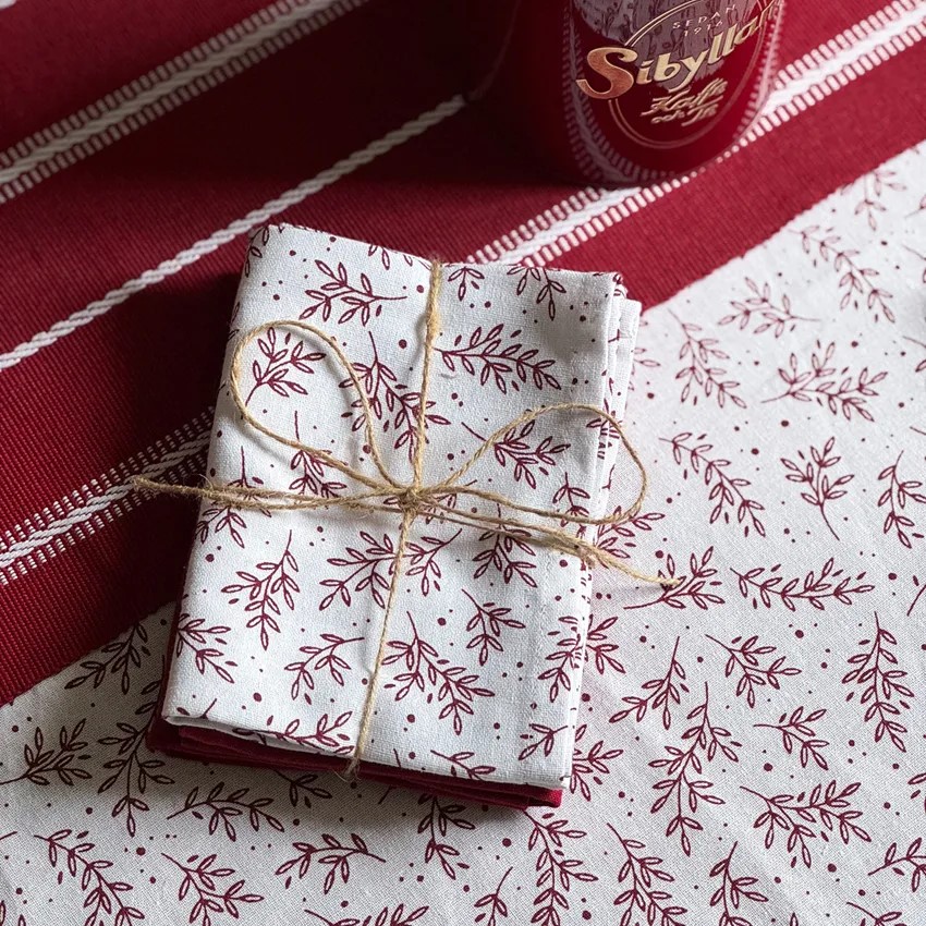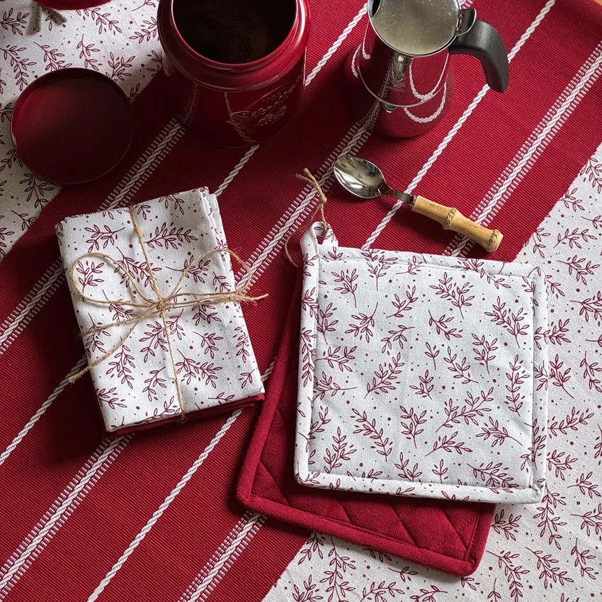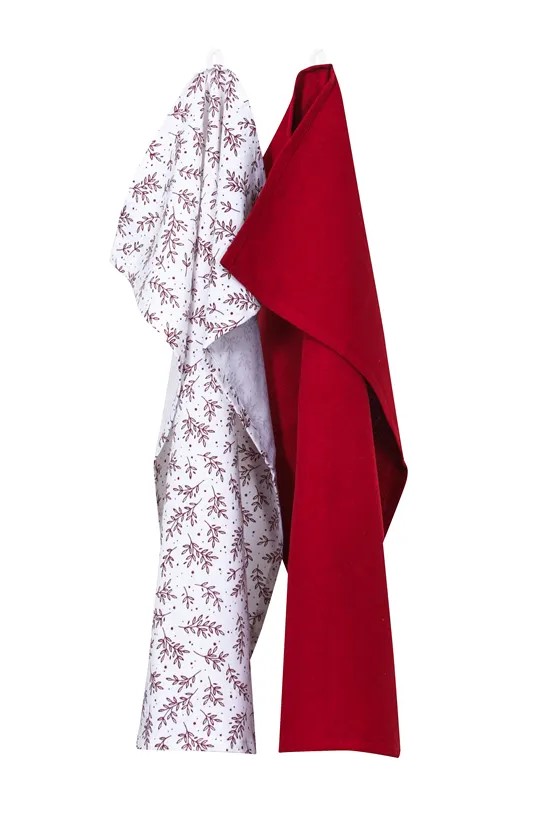 Kökshandduk Flora i vitt och rött. Två pack om en mönstrad och en enfärgad . Tillverkade i återvunnet textil material ,
