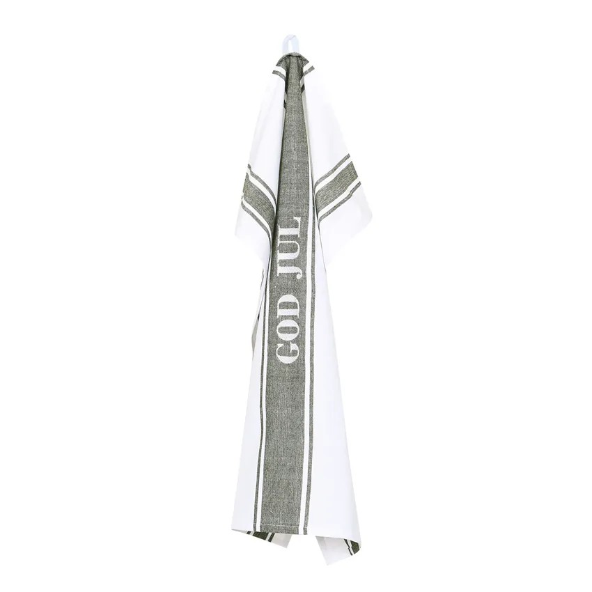 Kökshandduk God Jul i vitt och grön nyans. Vacker modell i gammeldags design. Tillverkad i återvunnet textil material. Bra för både människan och våran miljö.