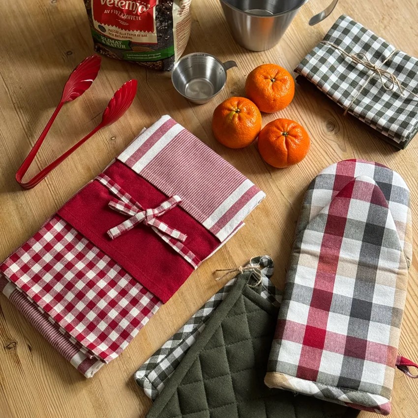 Kökshandduk Mikaela i röda och vita nyanser . Levereras i fint förpackad så det är en extra fin present att ge bort. Säljes i pack om tre olika kökshanddukar tillverkade i återvunnet textil material.
