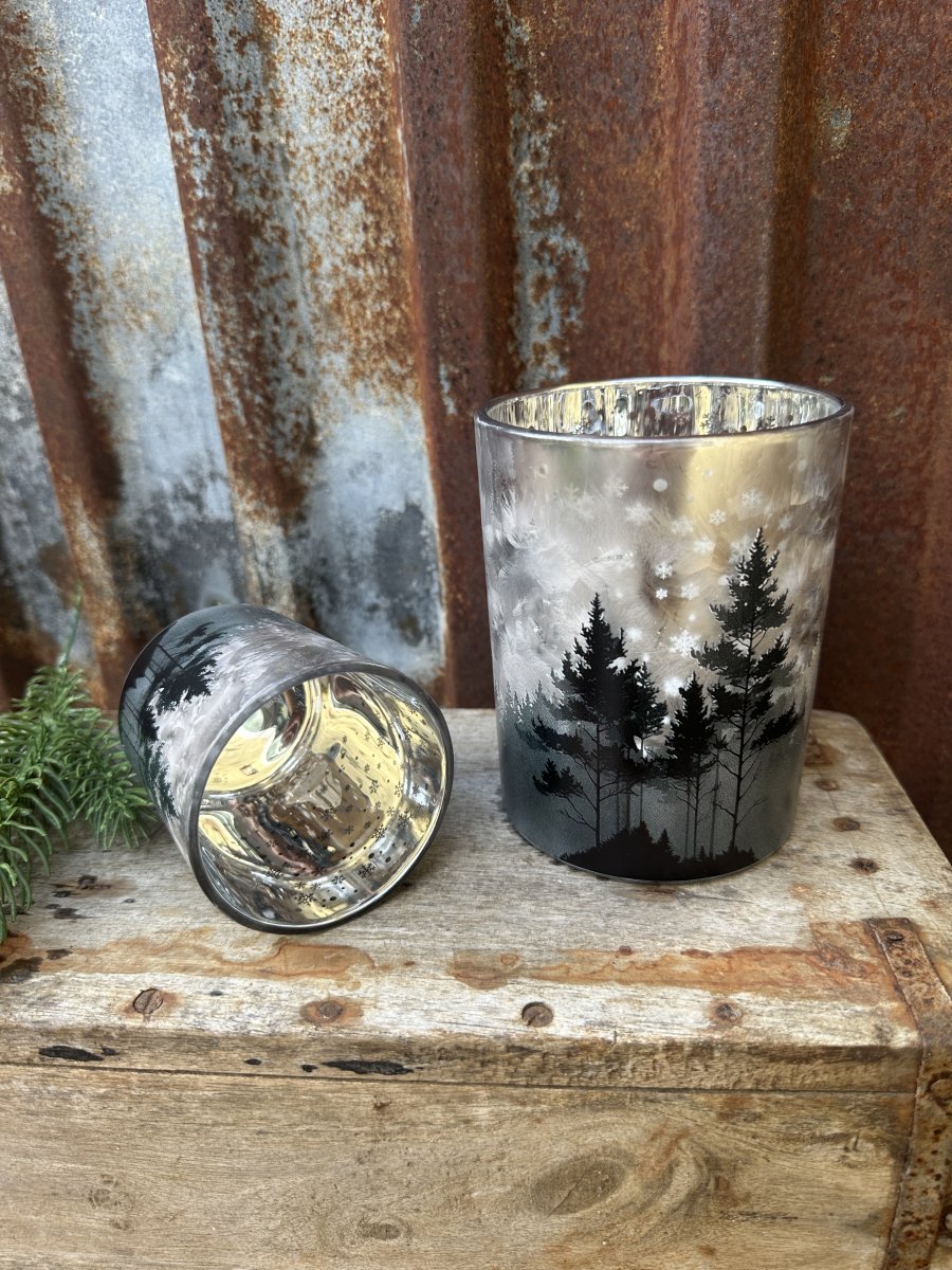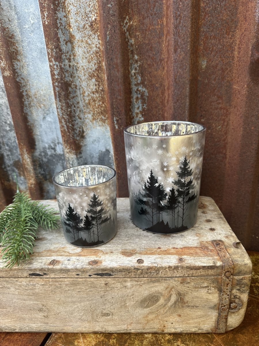 Ljuslykta vinter skog med frostad dekor i glas. Rund i formen och dekorerad med skogs motiv idova nyanser runt om. Finns i två storlekar