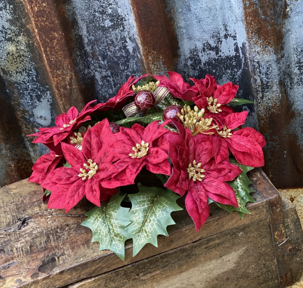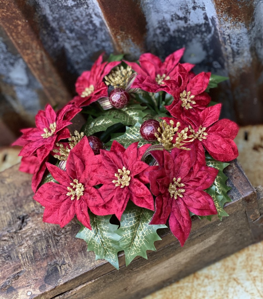 Ljusmanschett / krans i större modell för tex cylinderljus eller att ha som dörrkrans. Med mörk röda julstjärnor, mörk röda krackelerade bär och guld inslag. Vacker tät modell med sammets blad. Innermått stomme ca 7,5cm yttermått ca 25cm