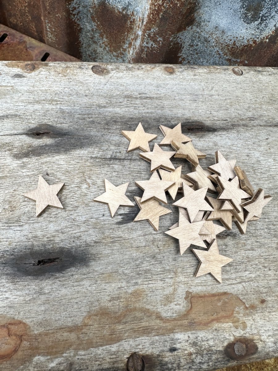 Påse med 24 stycken bruna natur stjärnor i trä att dekorera med. För pynt, pyssel, dukning och dekoration.