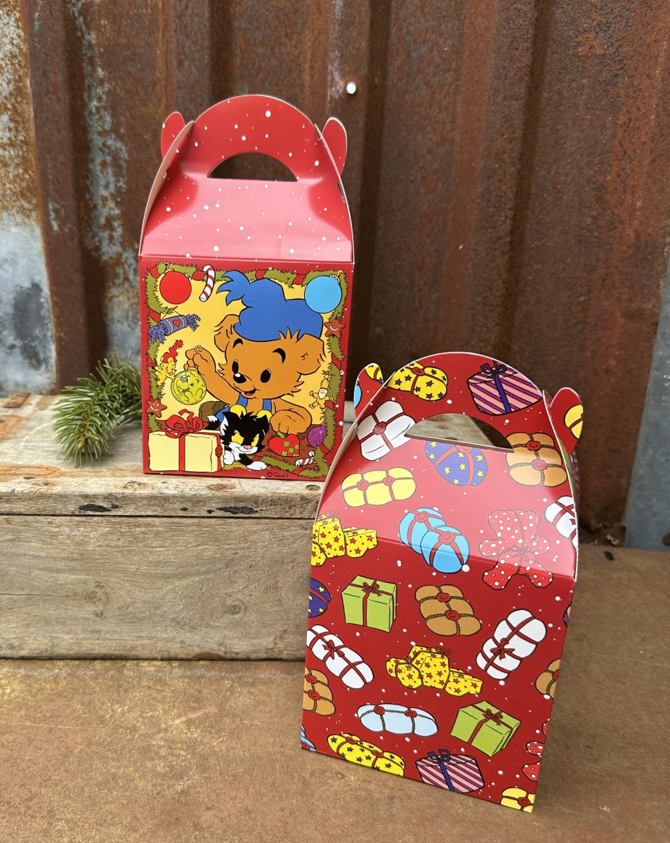 Present paket förpackning med BAMSE askar. Två fina askar med BAMSE motiv på en och paket motiv på den andra.
