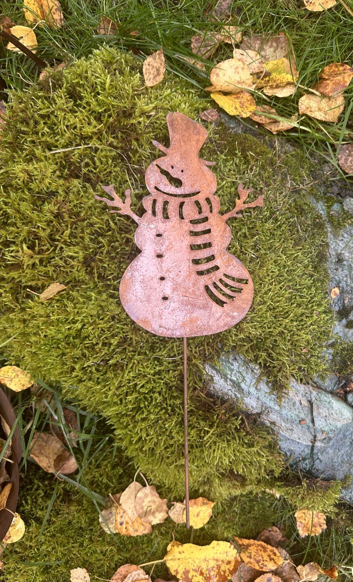 Rostig snögubbe på stick modell dvs på pinne att sätta i marken, rabatten eller blomkrukan. Tillverkad i metall med pinne i kraftig kvalité nertill.