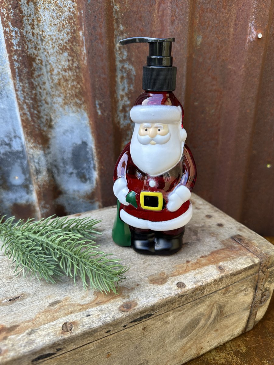Tvål handtvål med pump, tvålen är formad som en jultomte. Tvålen är röd och doftar tranbär .