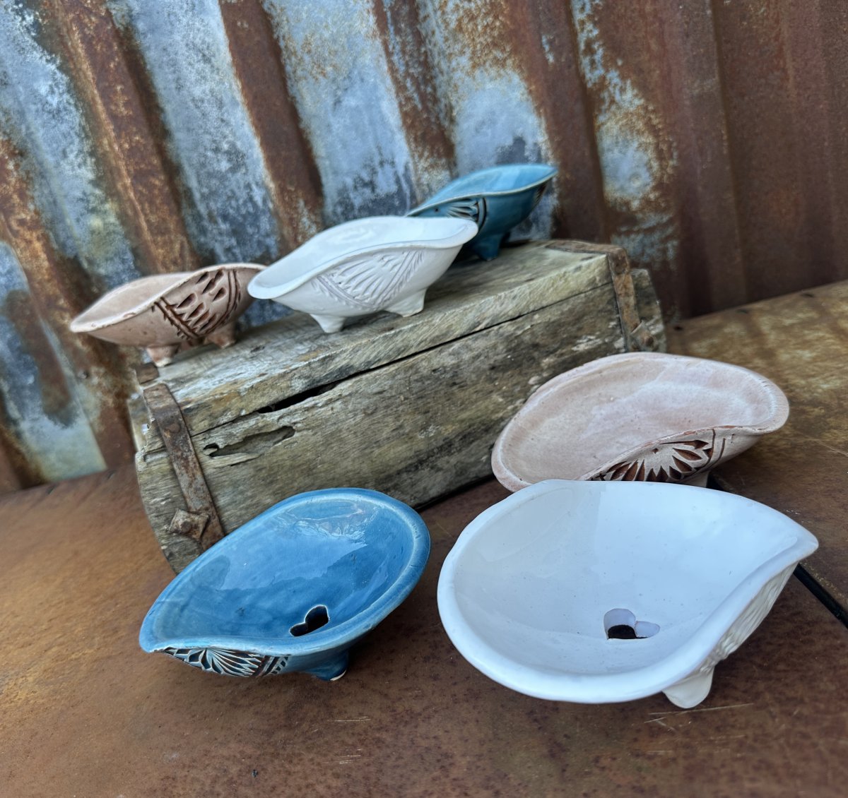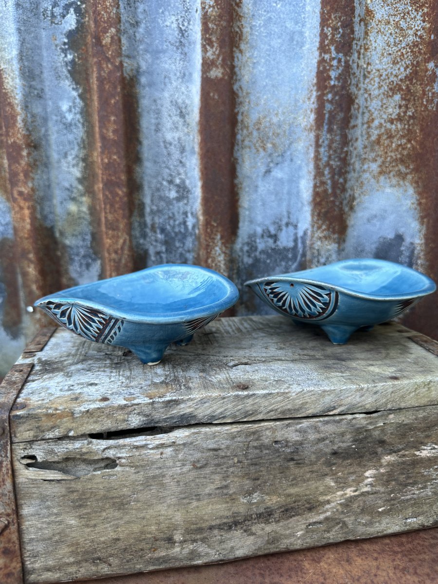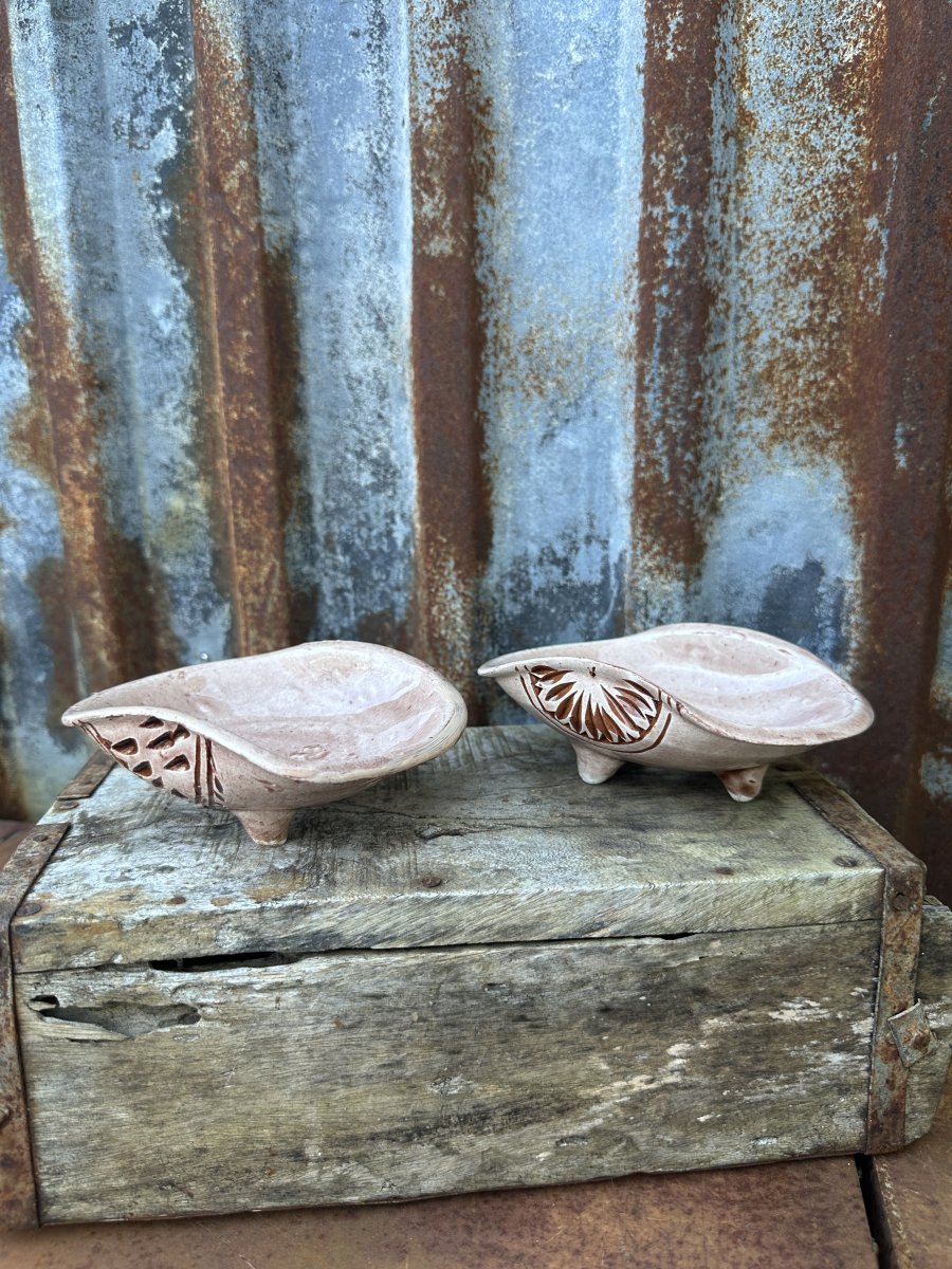 Vacker handgjord skål i spanskt lergods. En unik vacker lätt skålformad modell på tre tassar. Passande till tex tvålkopp. Finns i flera modeller