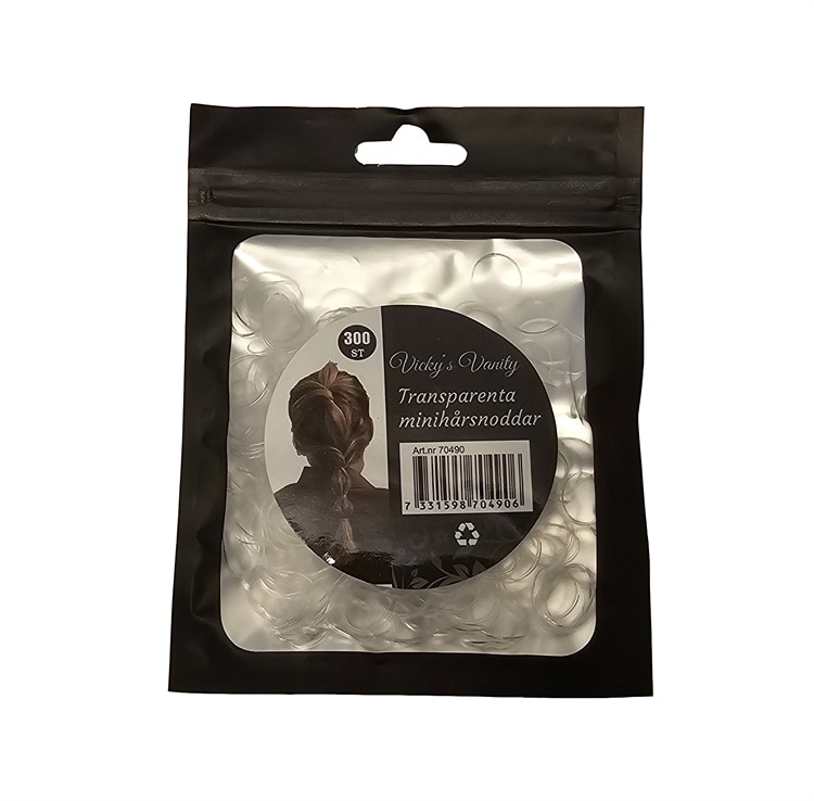 Små genomskinliga snoddar för hår i gummi. Perfekt för flätor tex säljes i förpackning om 300st snoddar.