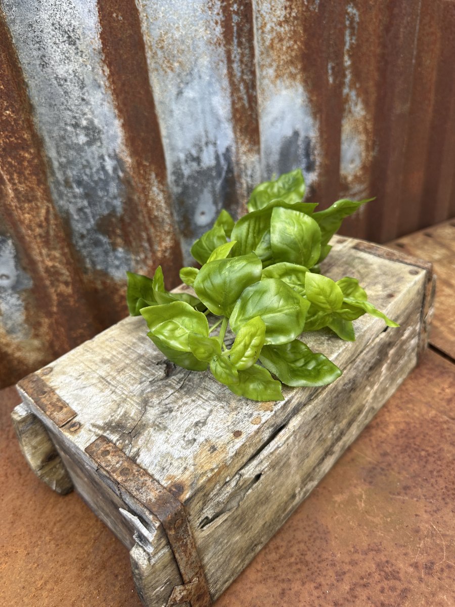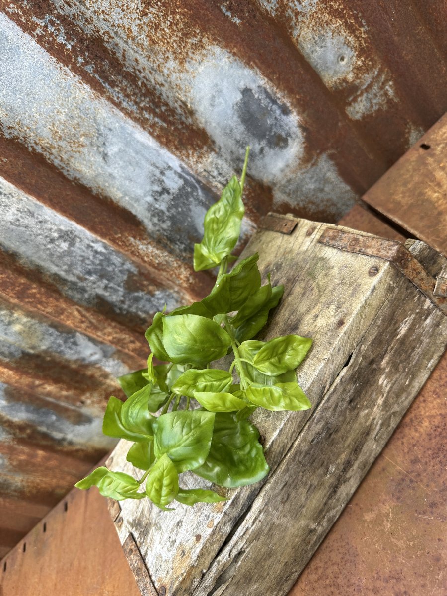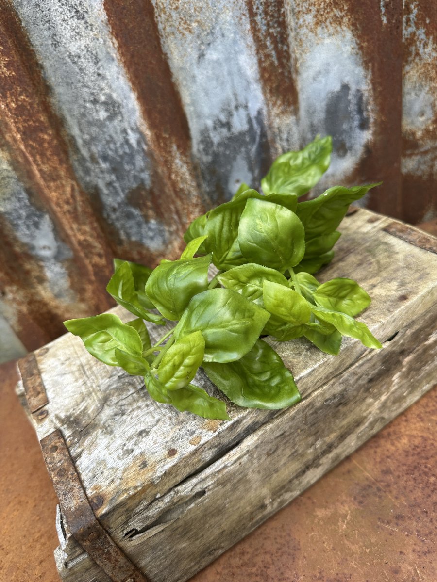Basilika kvist kryddväxt att dekorera med. vacker och verklighetstrogen konstväxt med klara gröna blad och stam. Med ståltråd inuti så man kan lätt leda böja som man vill. Vacker ensam i en vas/flaska eller flera tillsammans i en kruka.