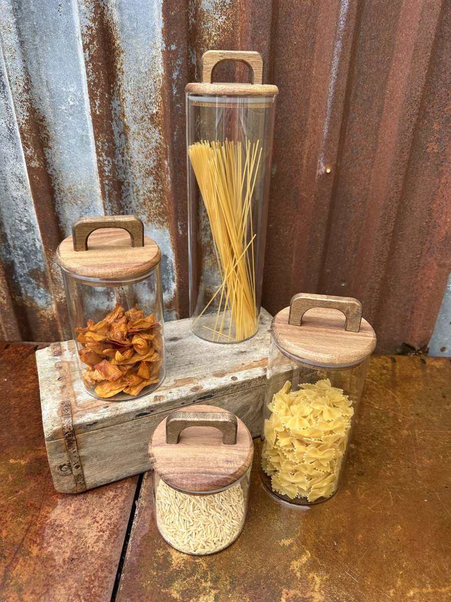 Förvarings burkar i glas med lock i akacia trä. Rundade i modellen med grepp vänligt lock. Finns i fyra olika storlekar