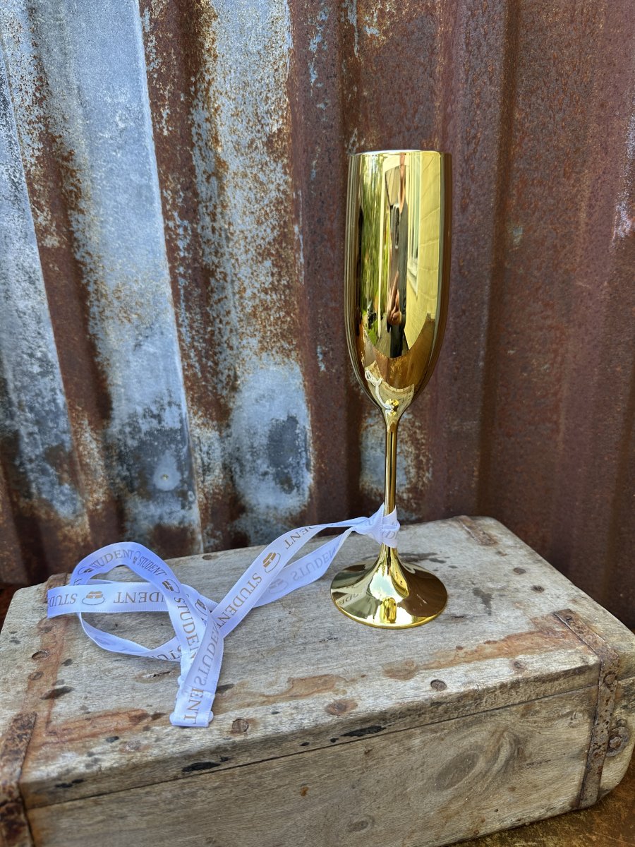 Fint guld färgat glas på fot till studenten. Tillverkat i hårdplast och har fint vit student band runt foten med text STUDENT och bild på studenthatt i guld. Anpassat för att hänga runt halsen med en spänne bak på bandet så det lossnar om man råkar fastna.