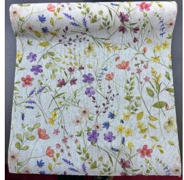 Löpare sommar med sommarblommor i fina nyanser på vit botten. Längre modell tillverkad i 70% polyester och 30% bomull.