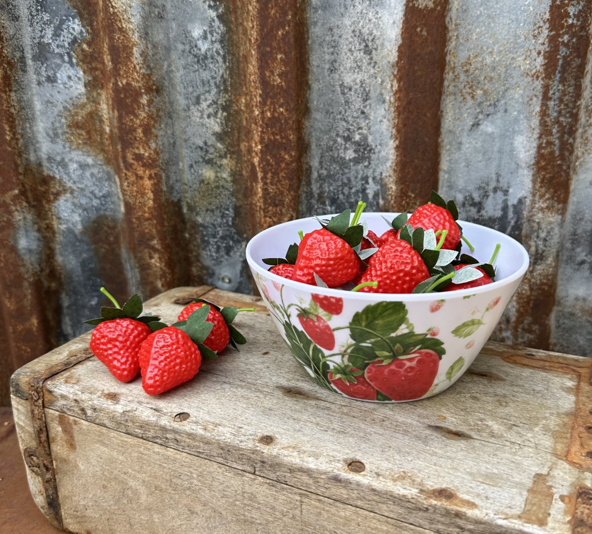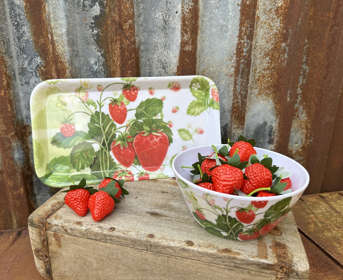 Sommar inspirerad skål med motiv av jordgubbar. Rund i modellen med motiv runt om på utsidan och vit insida. Tillverkad i melamin.