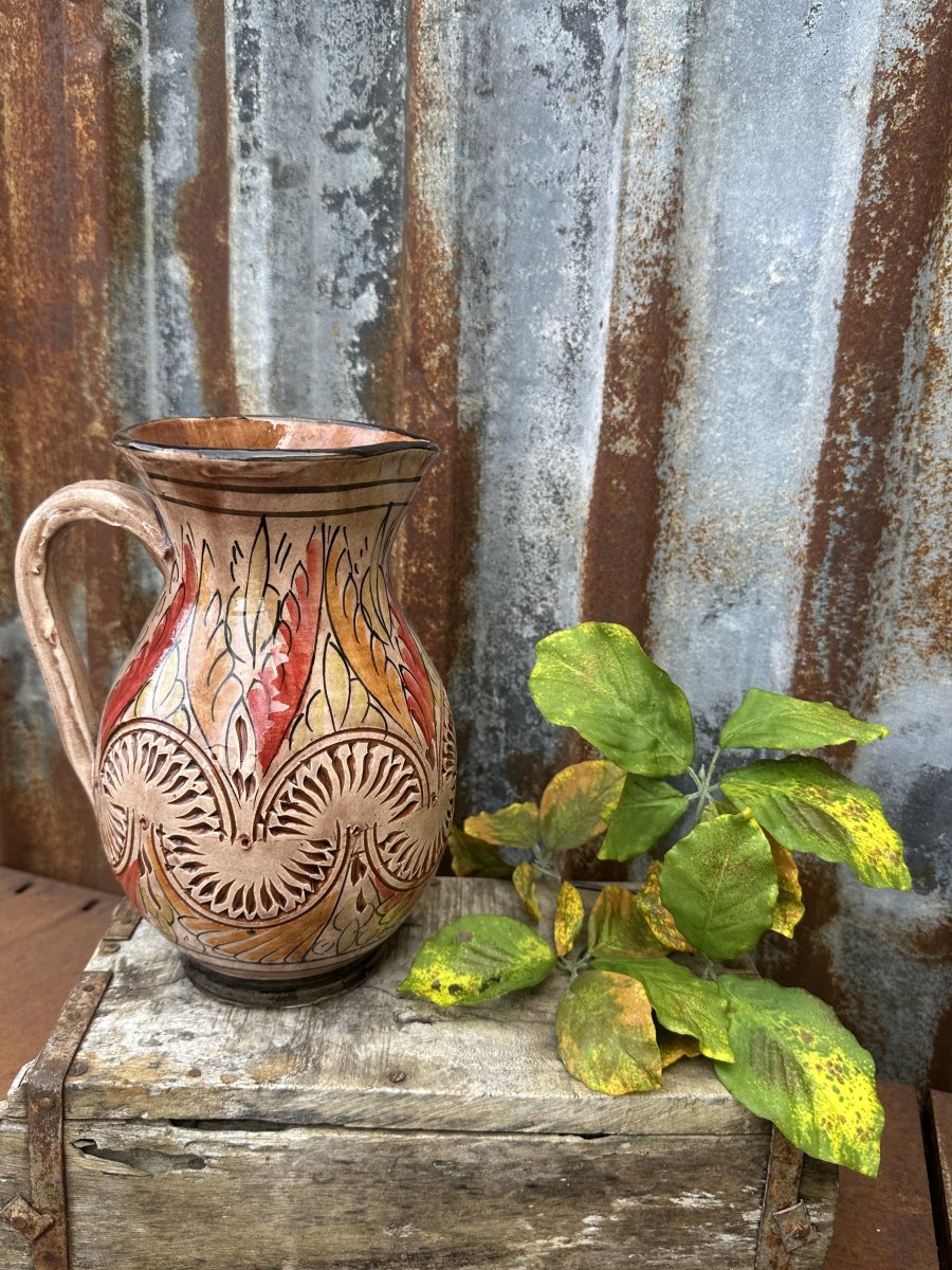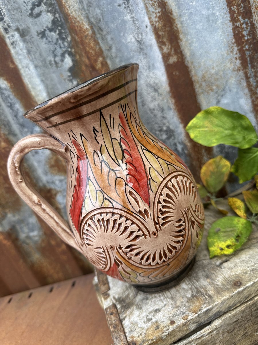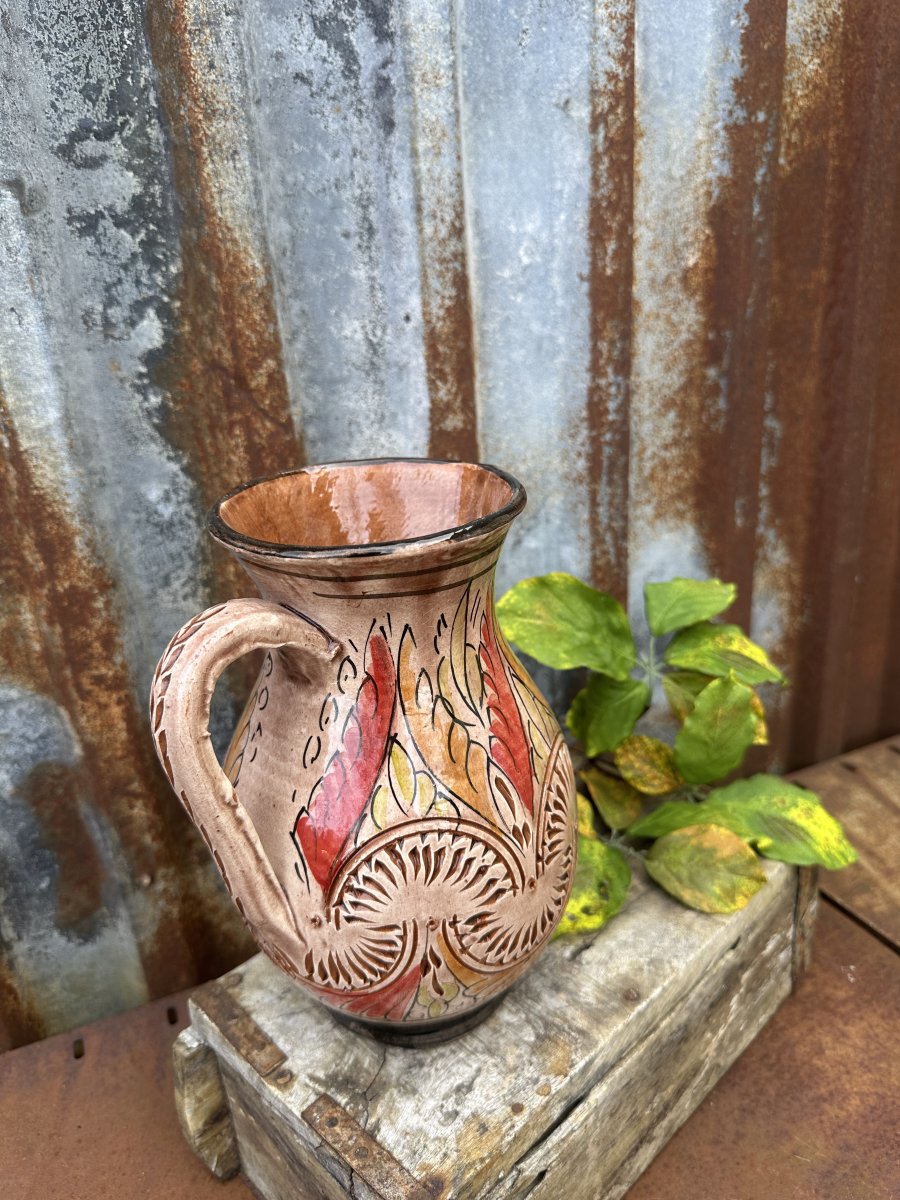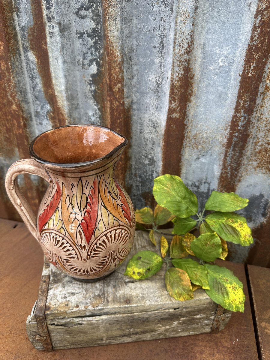 Vacker handgjord brun kanna i spanskt lergods. Glaserad yta med handmålat mönster runt om, med mönster som är utanpå liggande och inristat så man känner mönstret när man tar på kannan. Varje kannan är tillverkad för hand så varje kanna är unik och ingen är exakt den andre lik. Levande i modellen i äkta spansk andra.