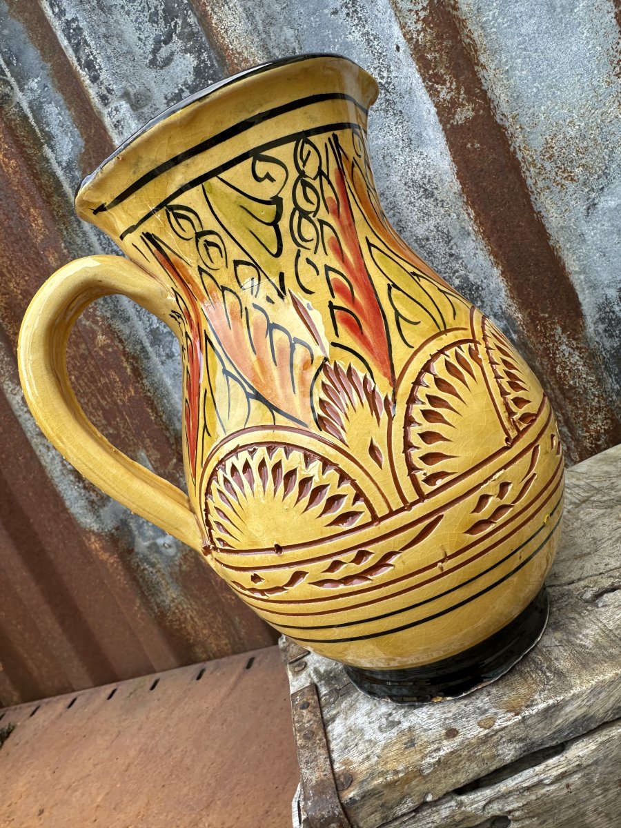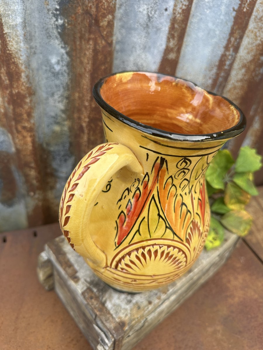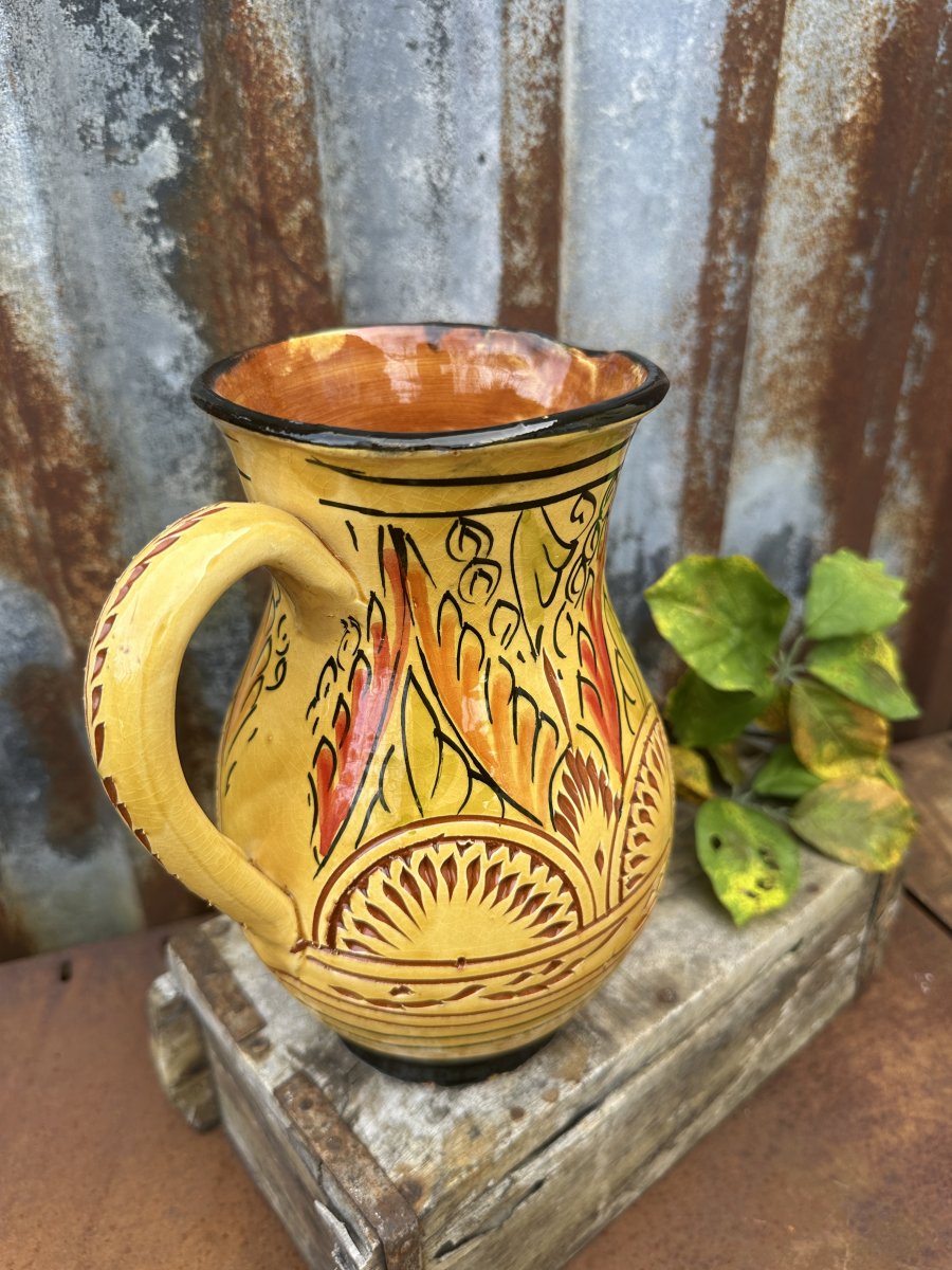 Vacker handgjord gul kanna i spanskt lergods. Glaserad yta med handmålat mönster runt om, med mönster som är utanpå liggande och inristat så man känner mönstret när man tar på kannan. Varje kannan är tillverkad för hand så varje kanna är unik och ingen är exakt den andre lik. Levande i modellen i äkta spansk andra.
