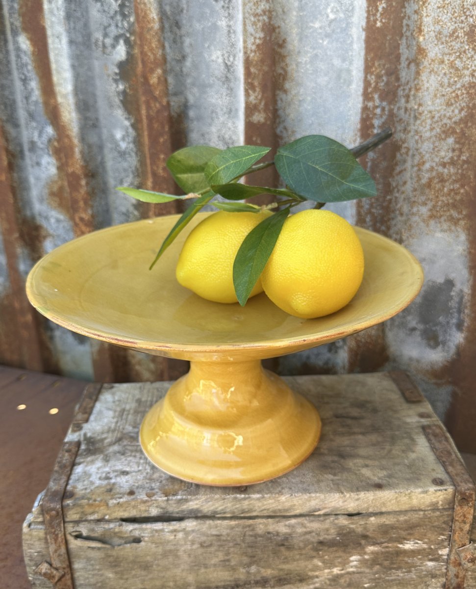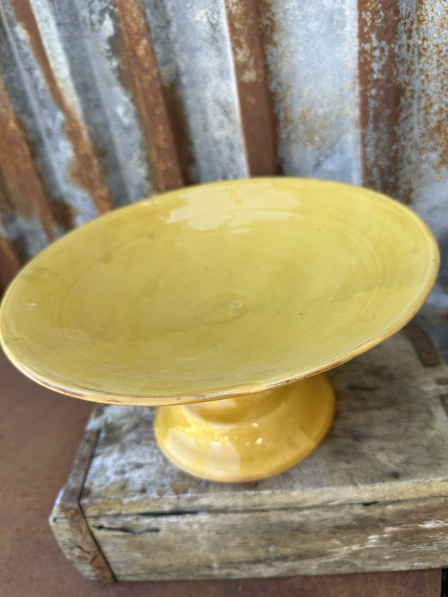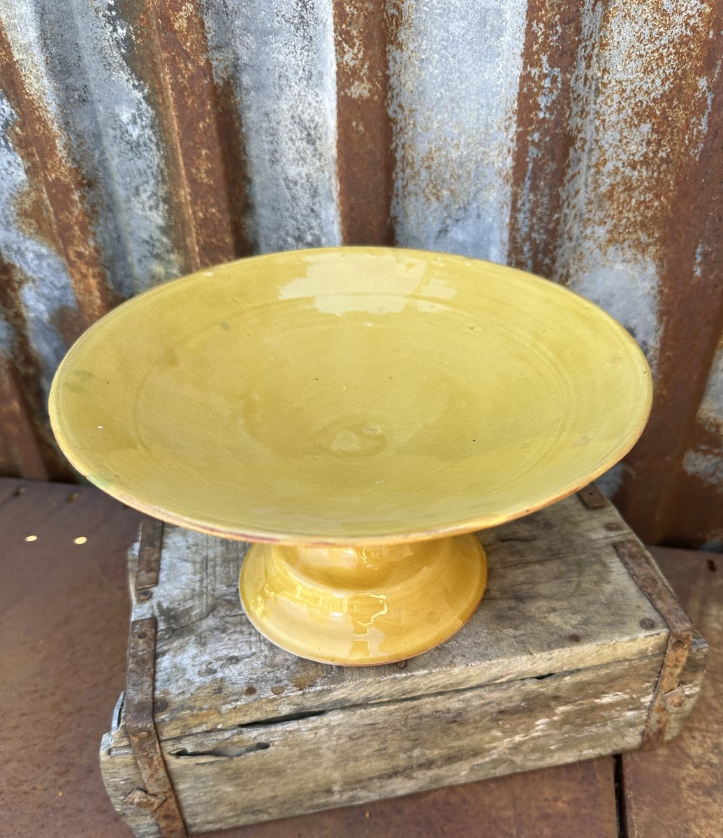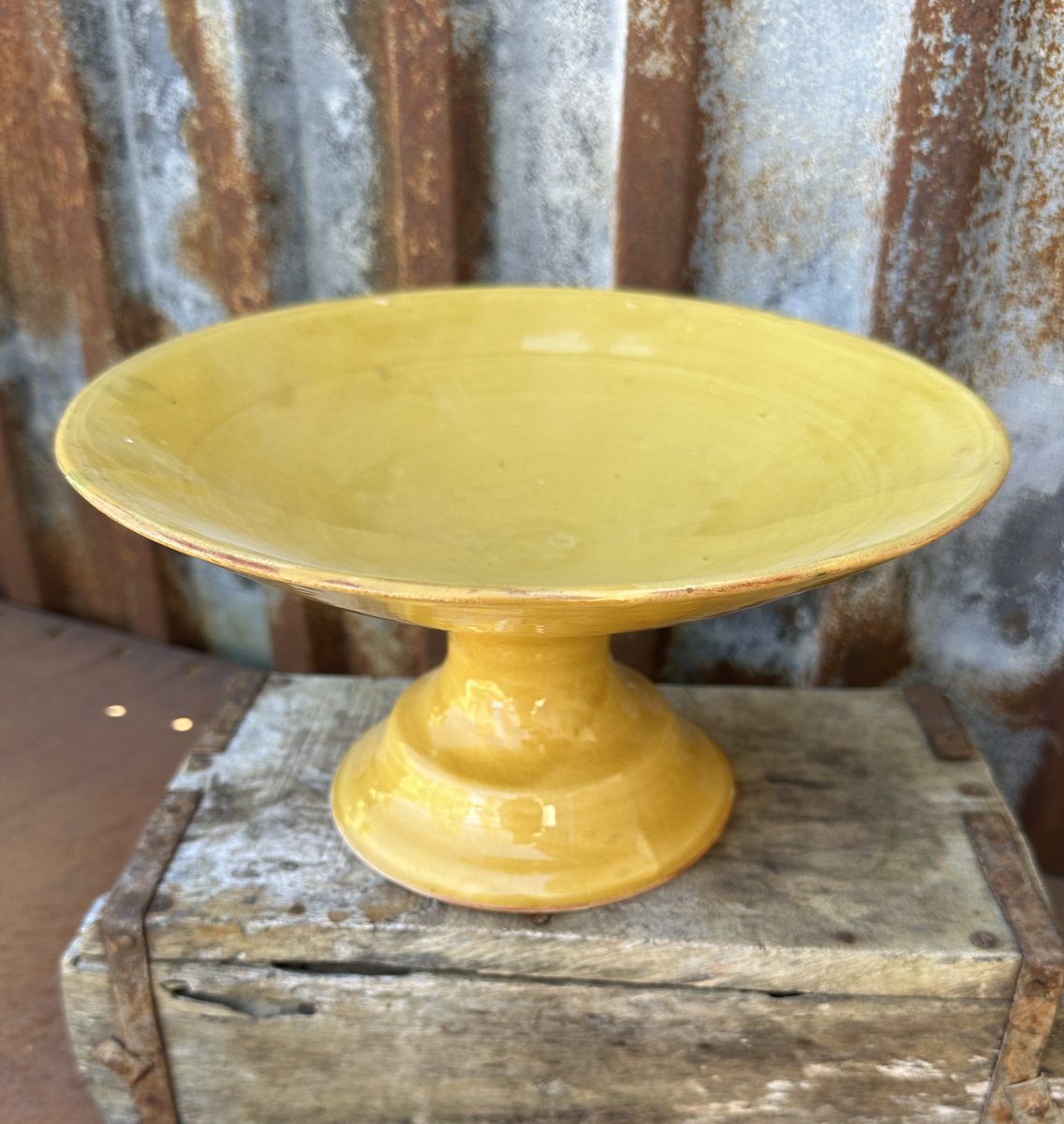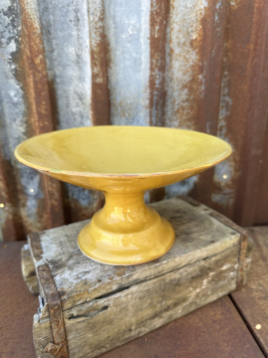 Vacker handgjort gult fat på fot i spanskt lergods. Glaserad krackelerad yta med levande färgskiftningar och fabriks skada inslag. Varje fat är tillverkad för hand så varje fat är unik och ingen är exakt den andre lik. Levande i modellen i äkta spansk andra.