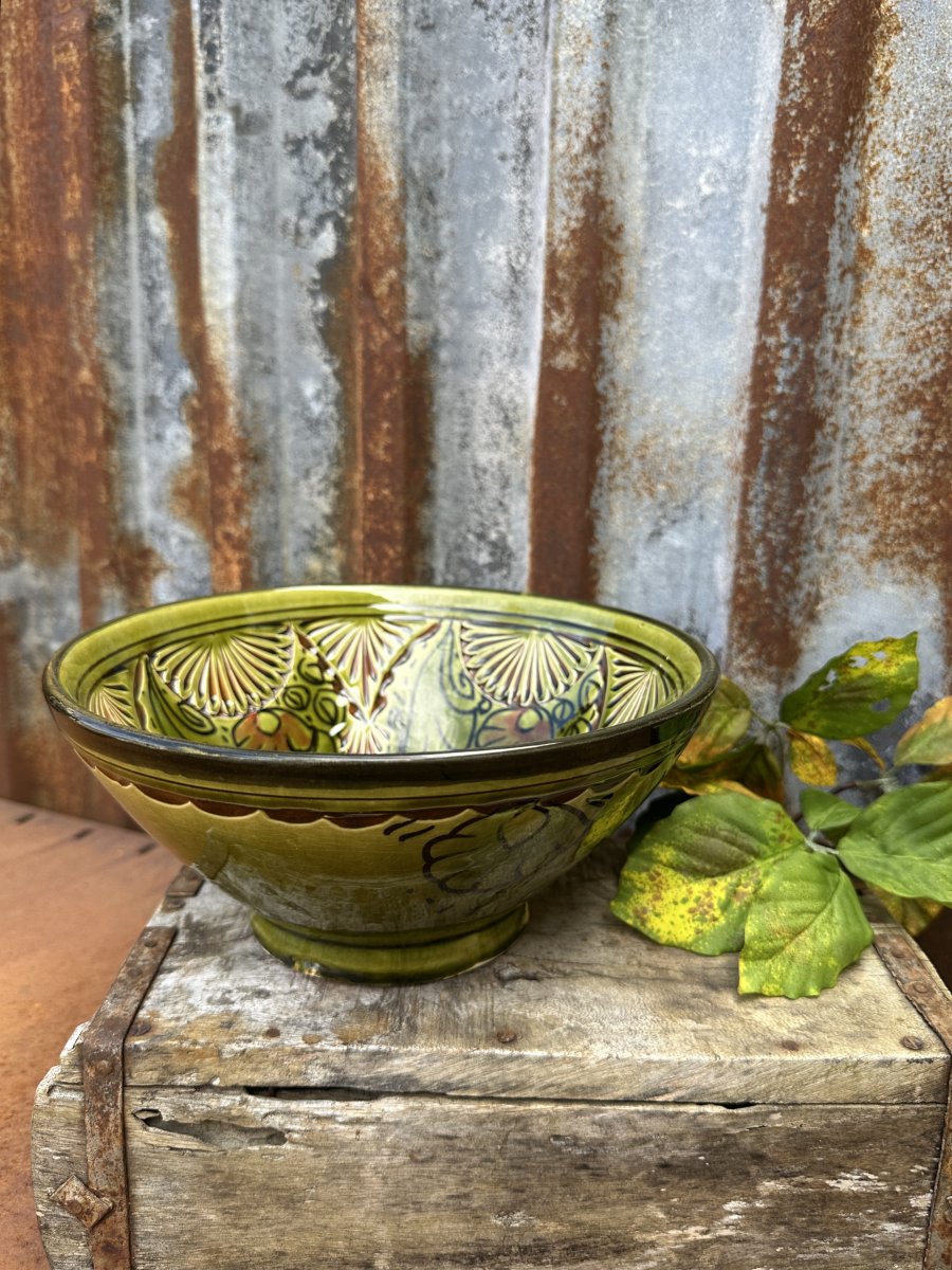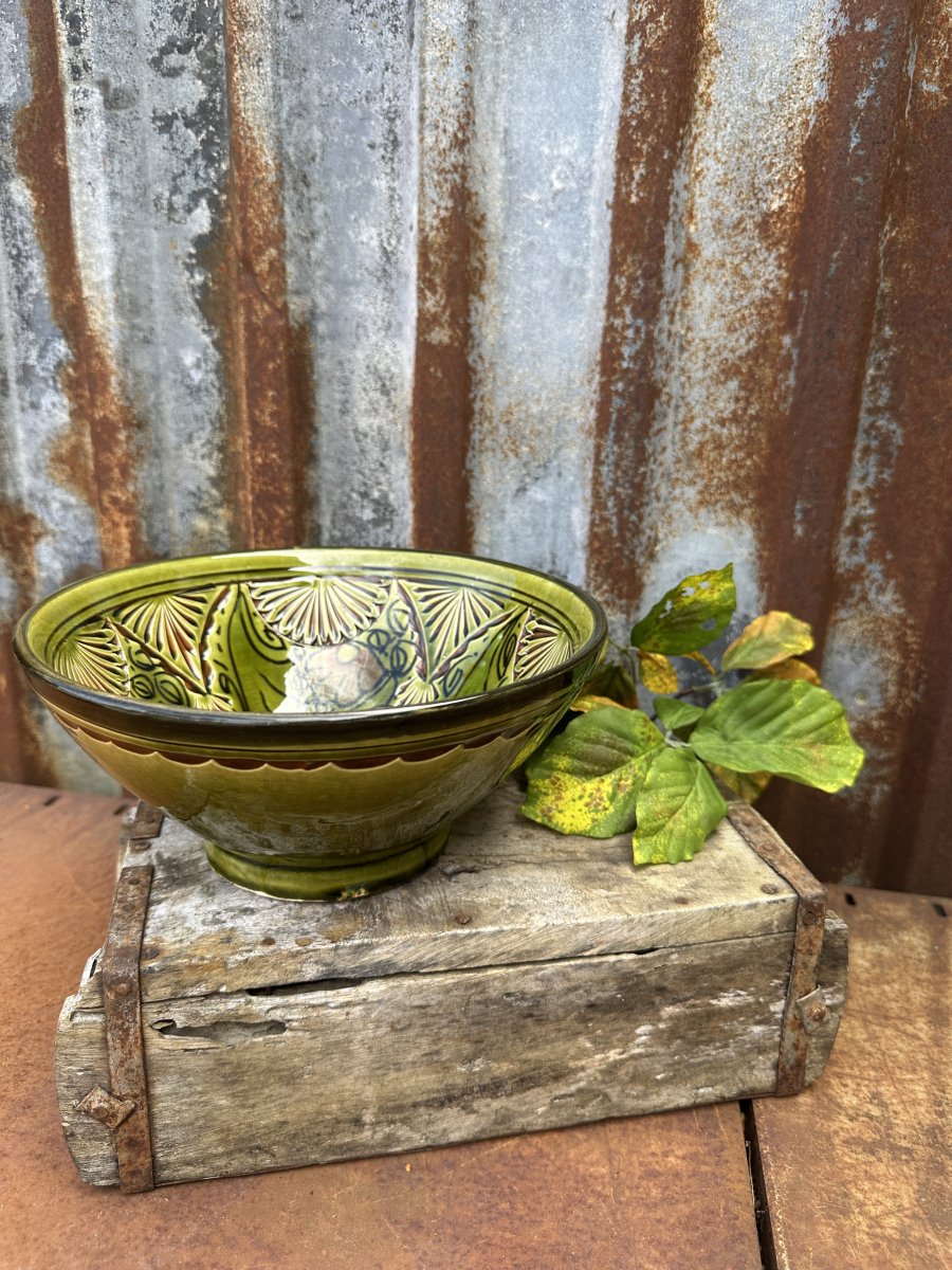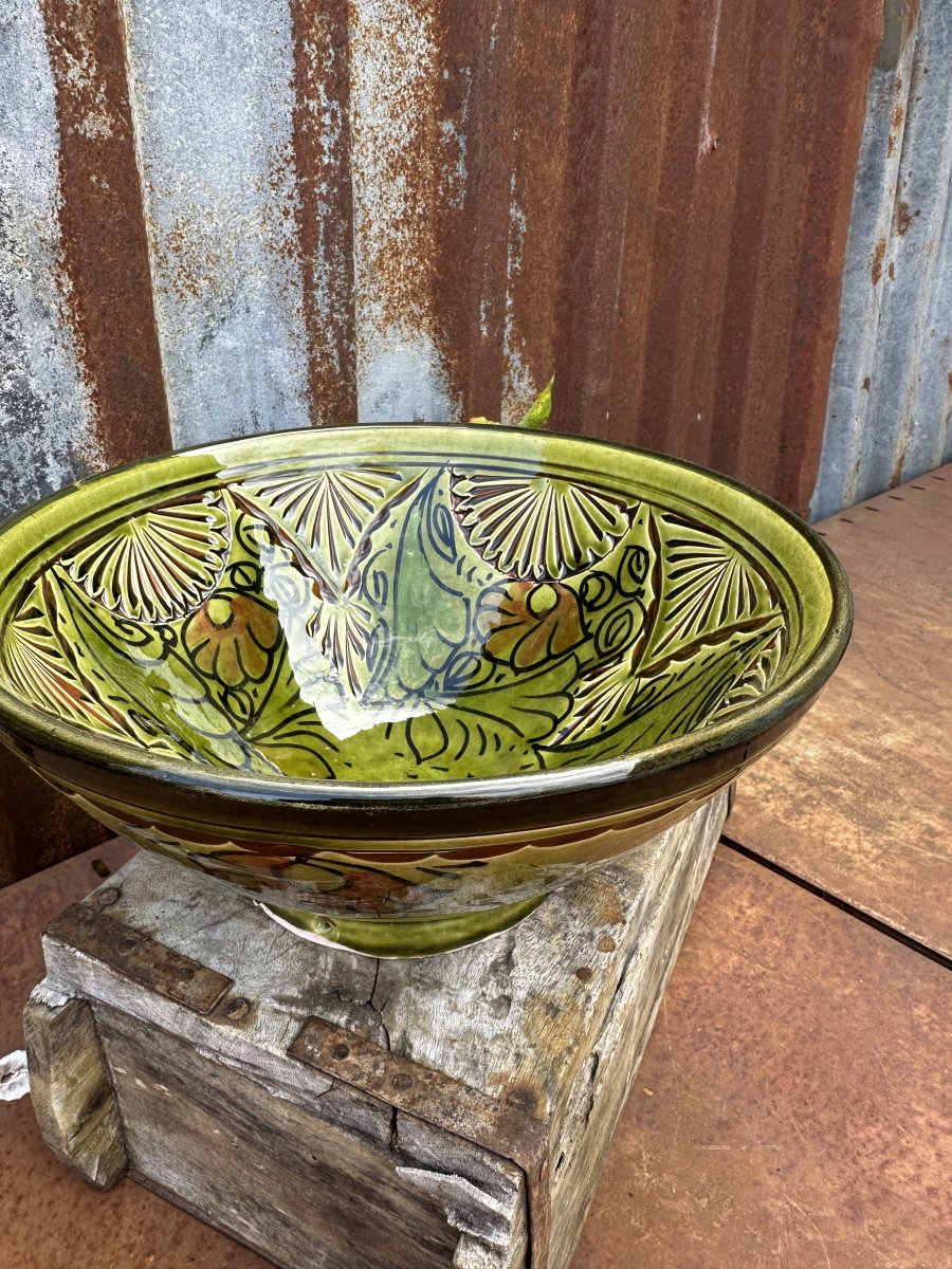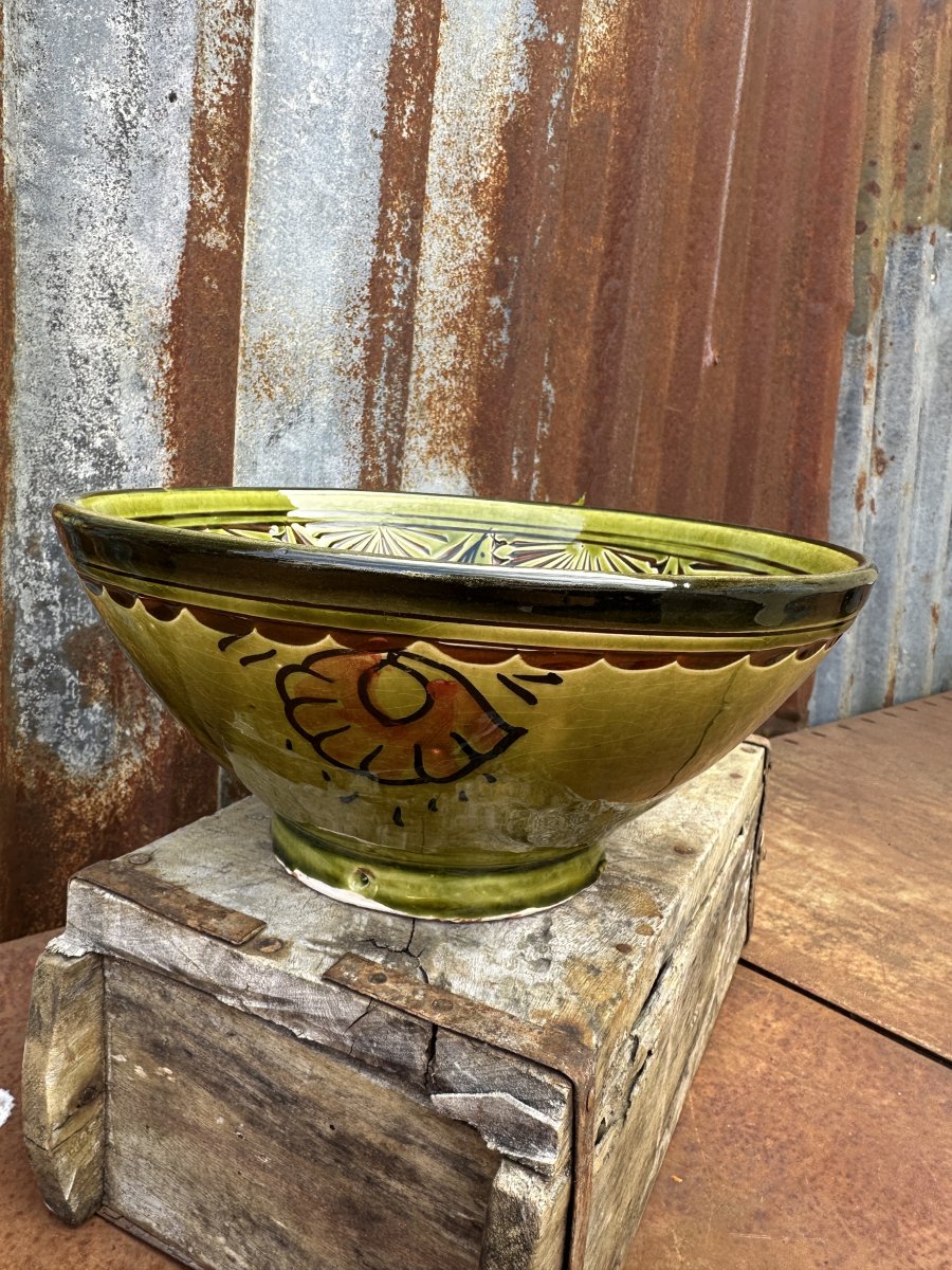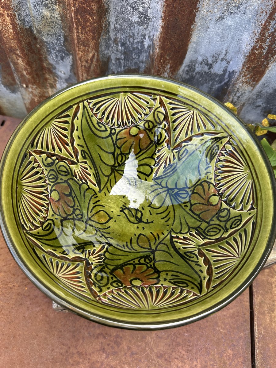 Vacker handgjord stor grön skål i spanskt lergods. Glaserad yta med handmålat mönster runt om, med mönster som är utanpå liggande och inristat så man känner mönstret när man tar på skålen. Varje skål är tillverkad för hand så varje skål är unik och ingen är exakt den andre lik. Levande i modellen i äkta spansk andra.