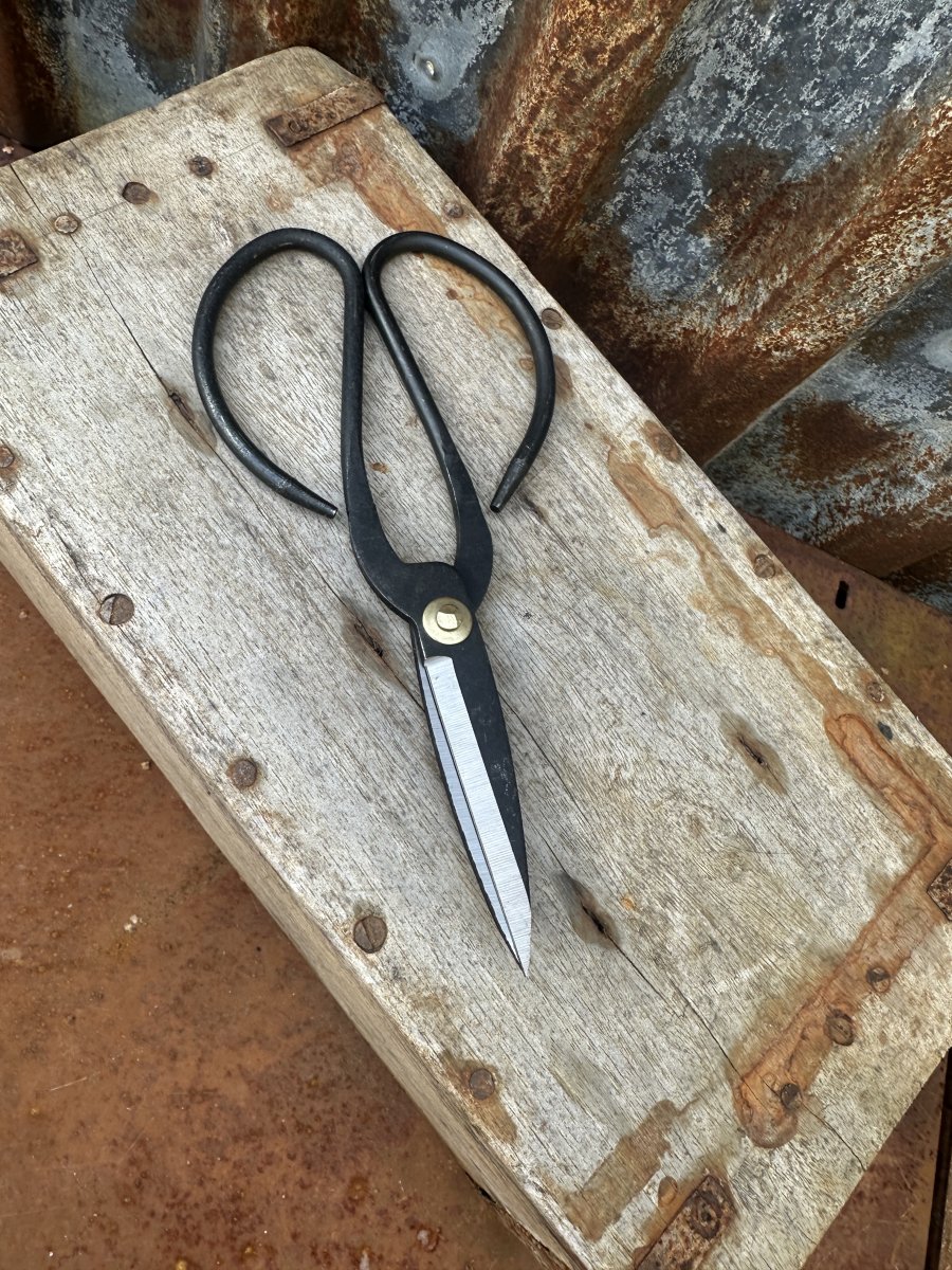 Gammeldags designad större sax i järn. Vackert och praktiskt som fyller sin funktion och gör nytta inomhus som utomhus. Går i en svart nyans med slipade klipp/äggs ytor.