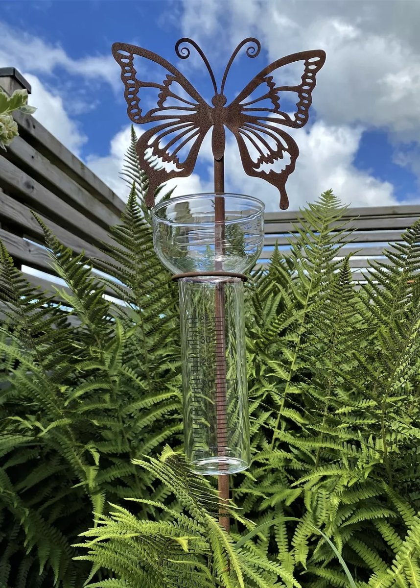Regnmätare med fjäril i rost. Högre modell på pinne med ankar fot att sätta fast i marken. Fjärilen är detaljrikt dekorerar. Mätglaset är i glas. Går i ruffigt rost och varje regnmätare är unik i rost utförande blir mer och jämnare rost när man har den utomhus.
