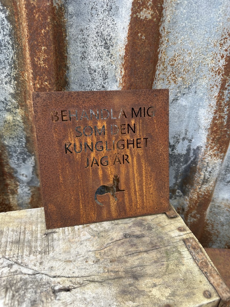 Rost skylt med text BEHANDLA MIG SOM DEN KUNGLIGHET JAG ÄR och med en katt med krona. Att sätta upp på väggen eller i ett armeringsnät. Skyten har små hål i hörnen för uppsättning.